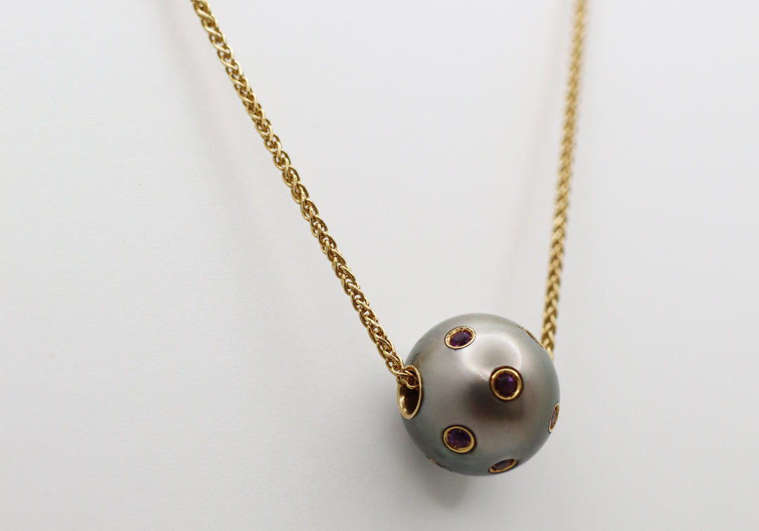 - Genuine Tahitian pearl with natural amethysts inlaid in yellow gold tubes. The pearl is mounted on a 16-inch wheat chain.
