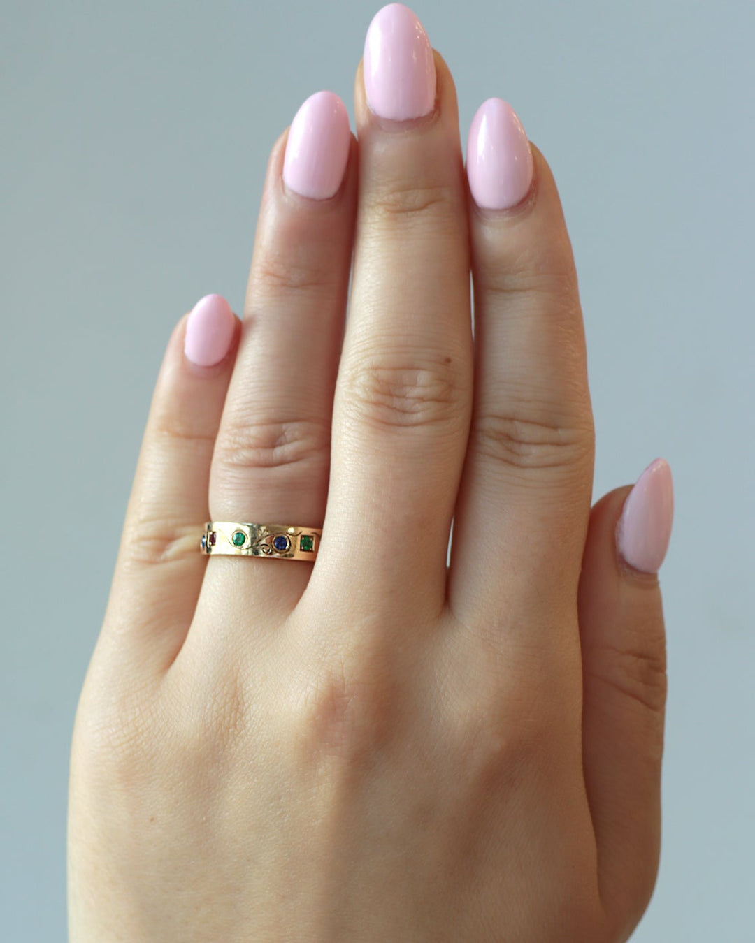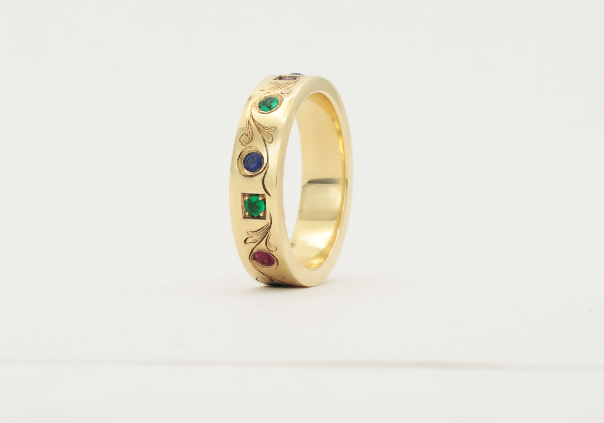 - La bague est sertie d'émeraudes, de saphirs et de rubis naturels.