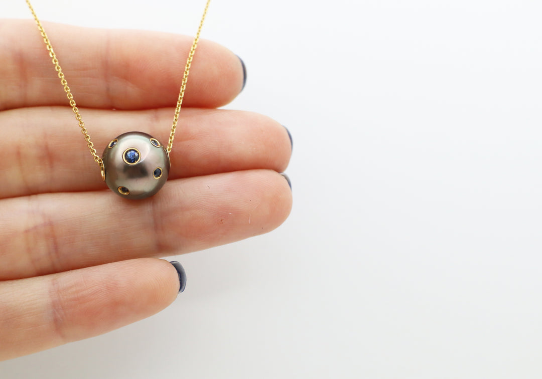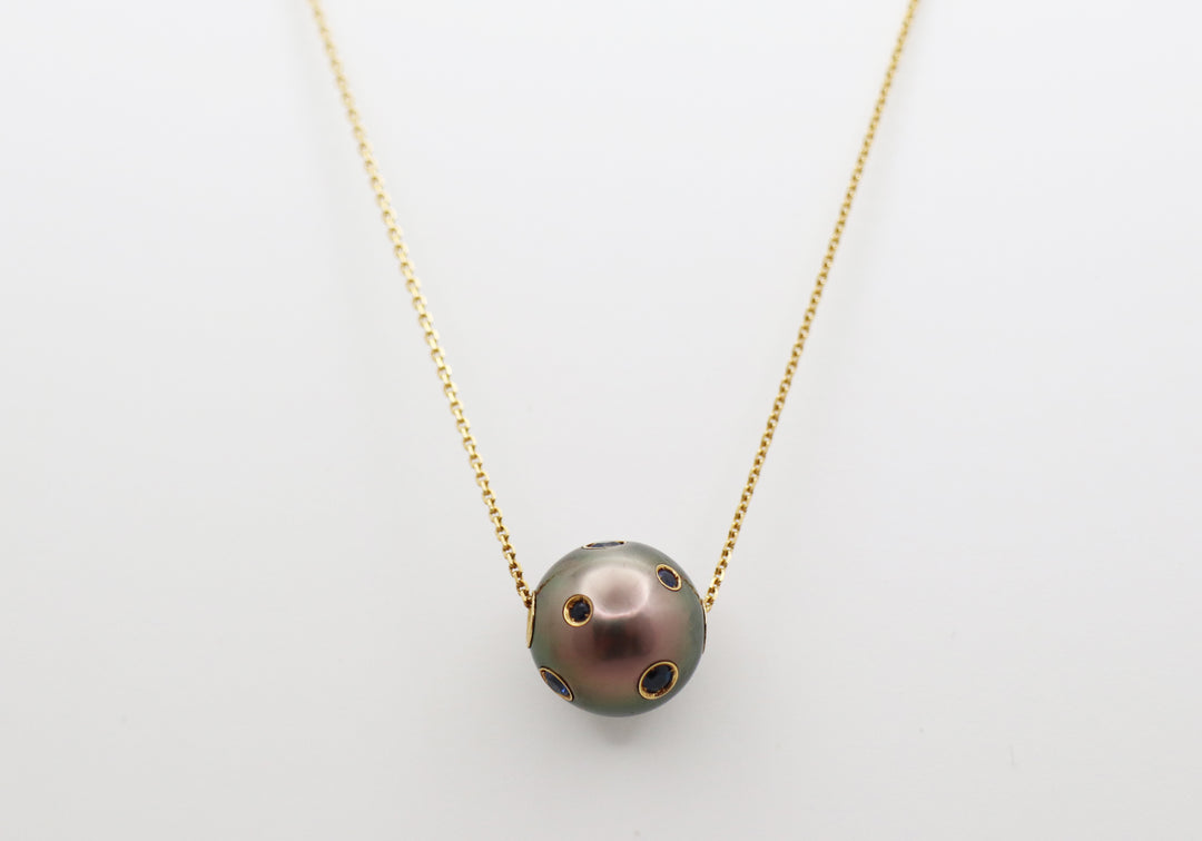 - Genuine Tahitian pearl with natural sapphires set in yellow gold tubes. The pearl is mounted on a 16-inch chain.