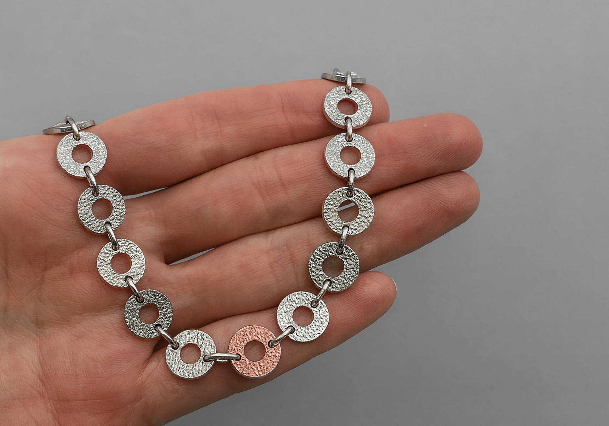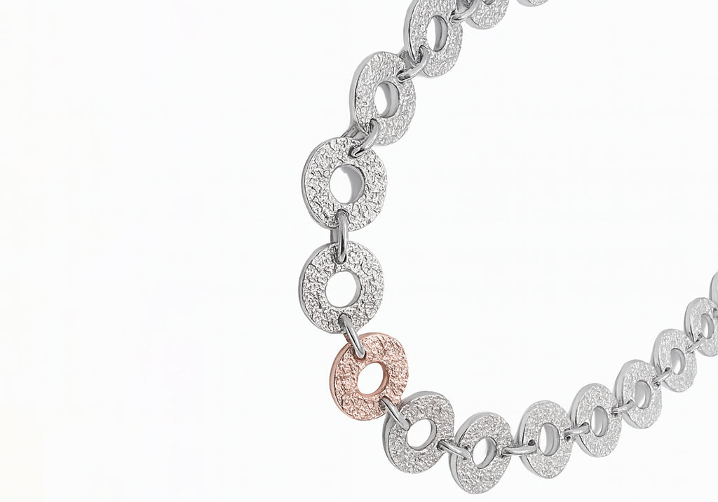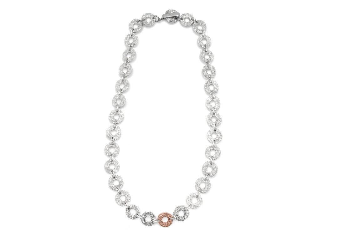 - Necklace with textured rings in sterling silver and 10K rose gold.