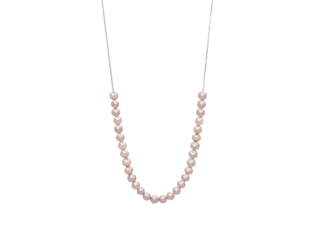 - Thirty 4mm pinkish freshwater pearls lined up on a gold necklace.