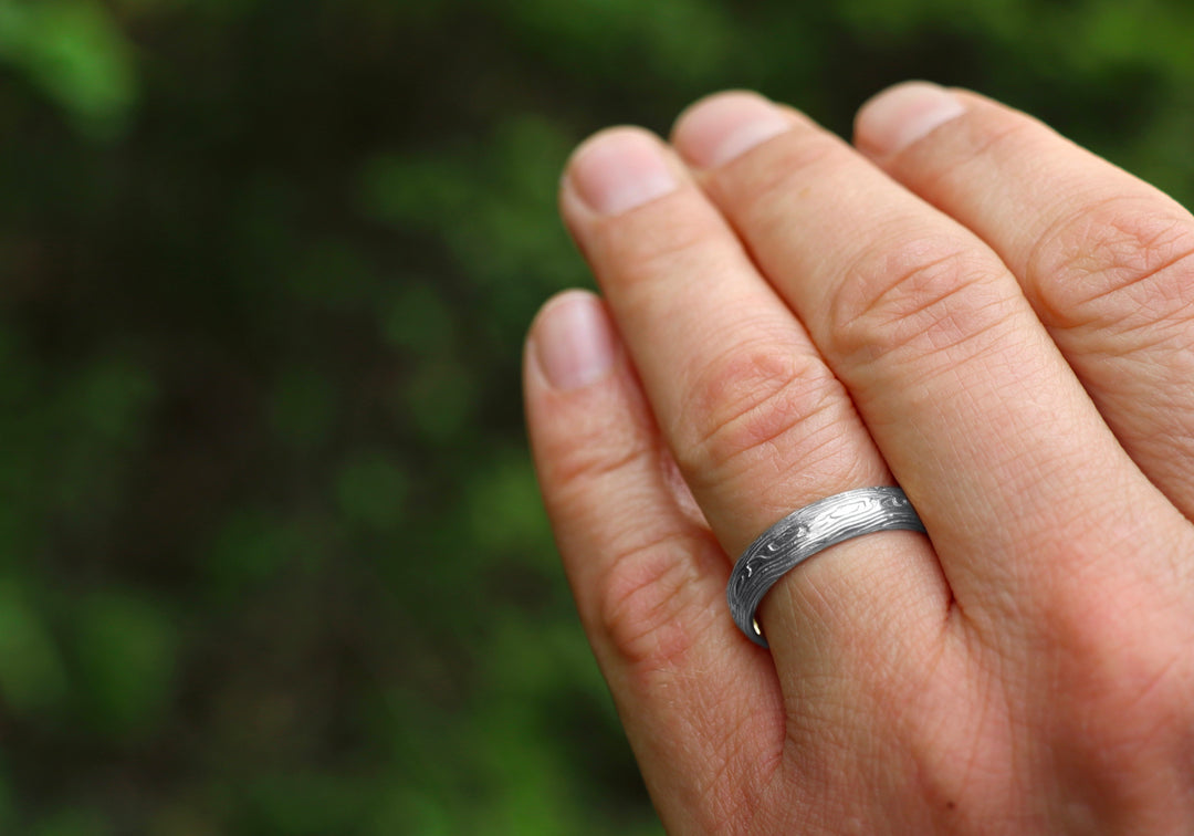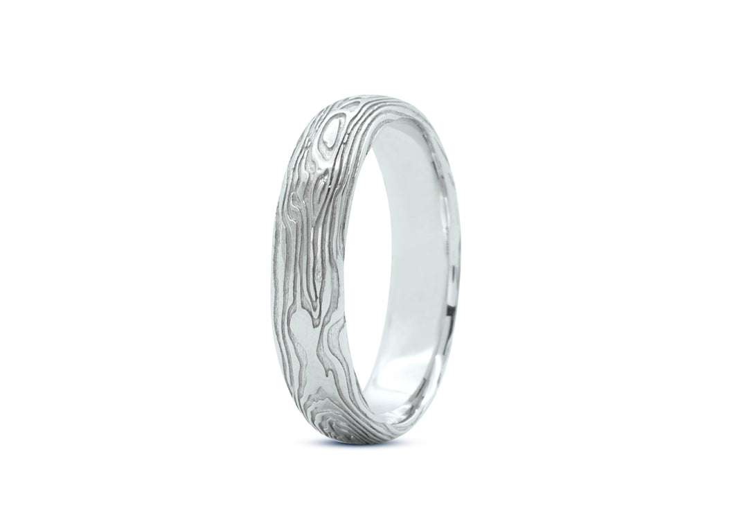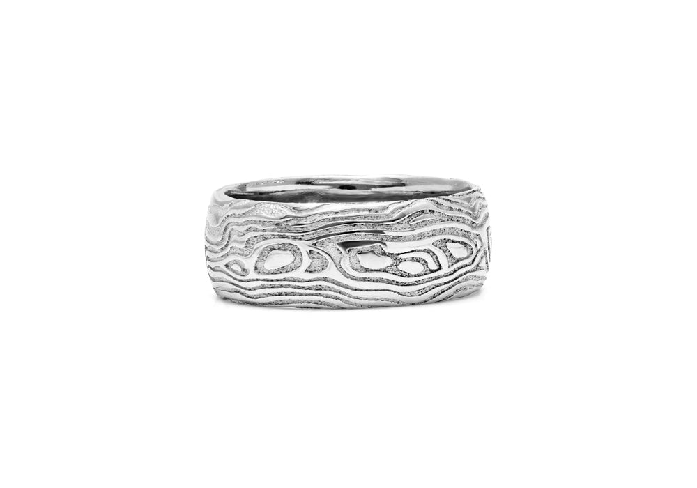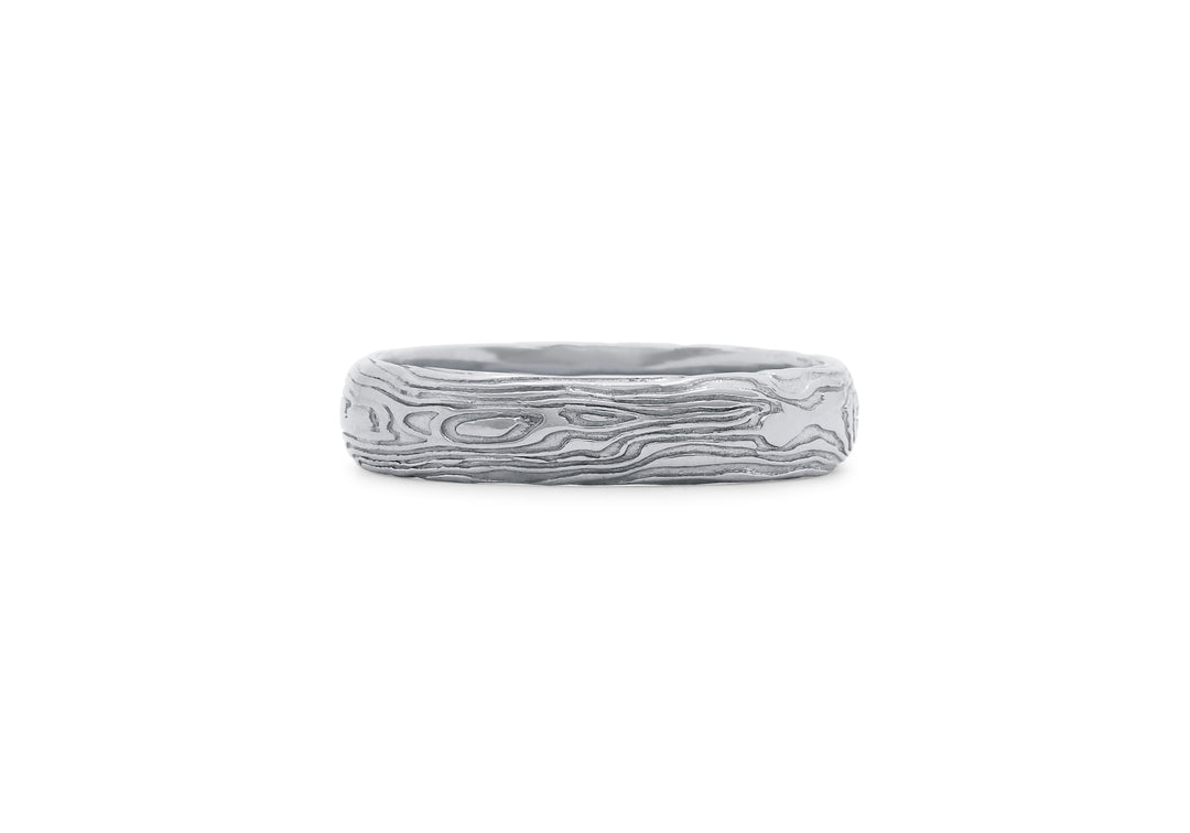 - A band for men in sterling silver with a texture reminiscent of wood bark.