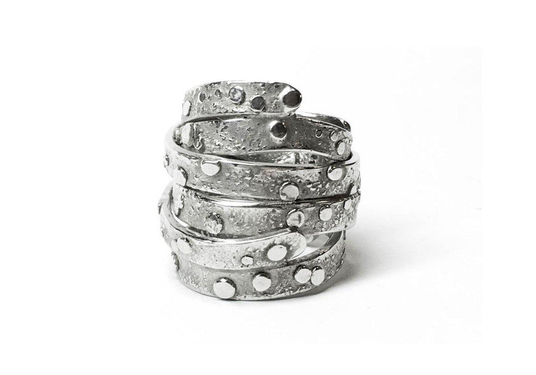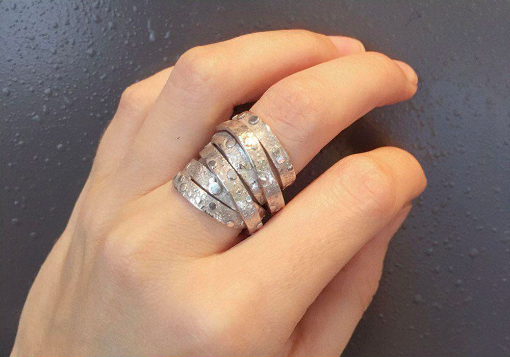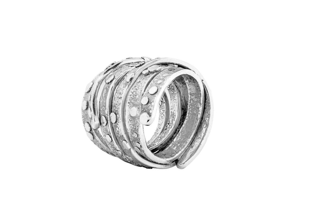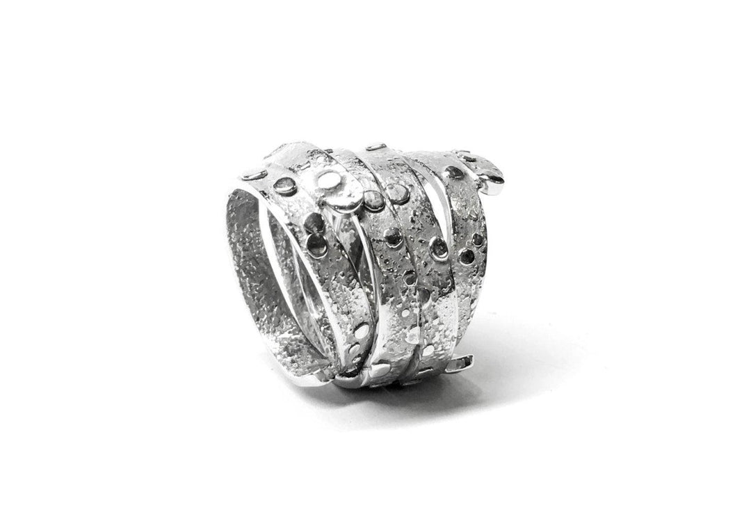 - Sterling silver overlapping textured bands.
