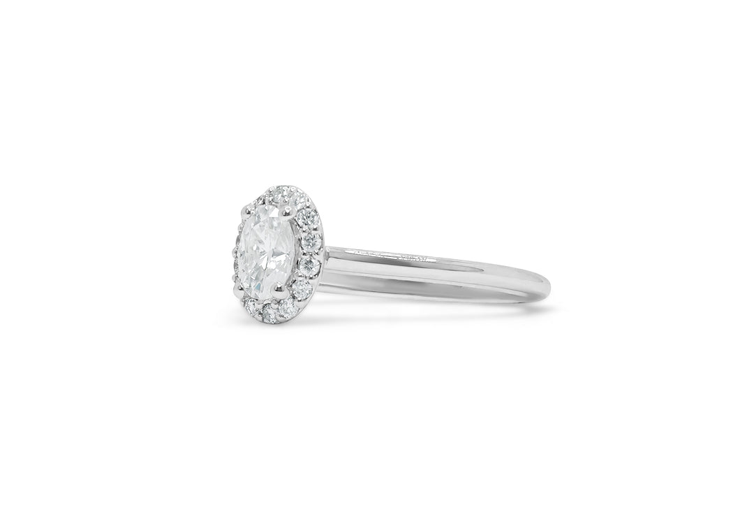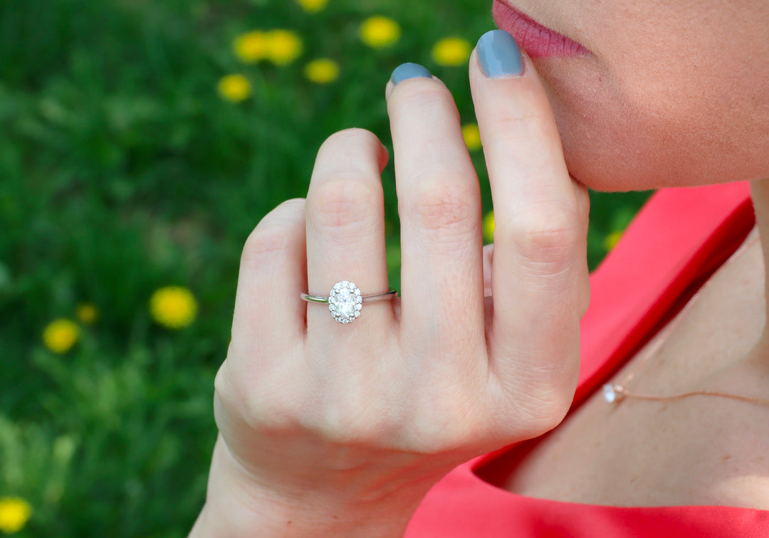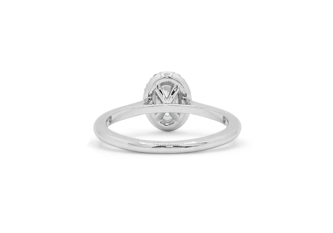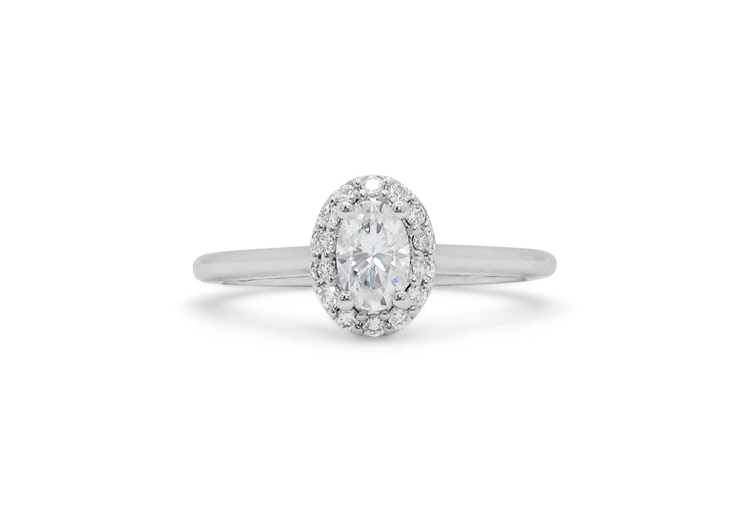- Solitaire with an oval diamond and a halo.