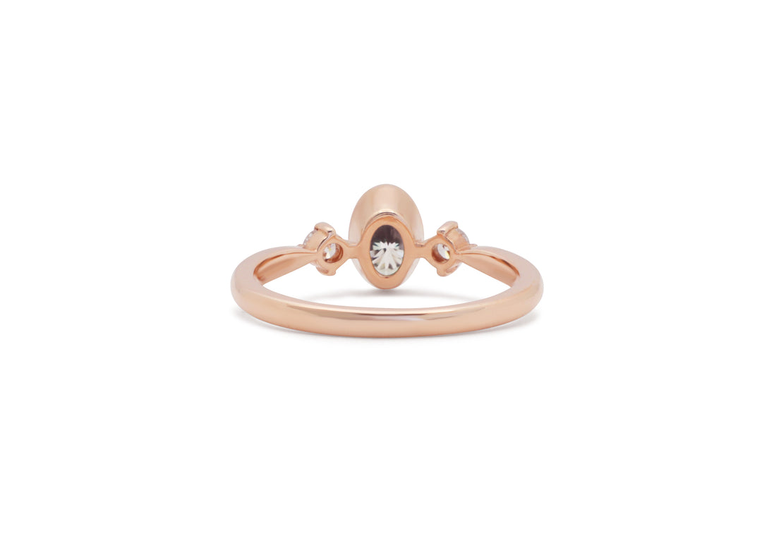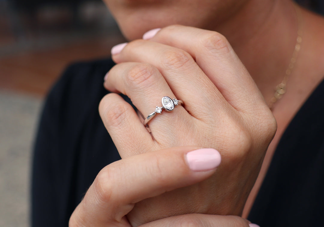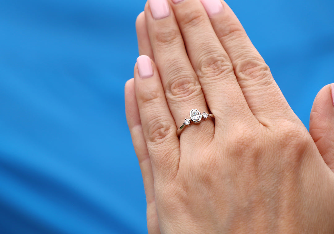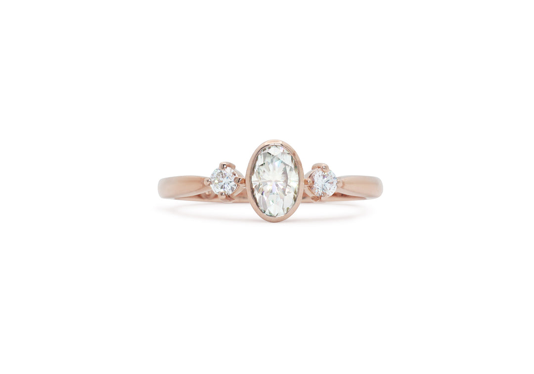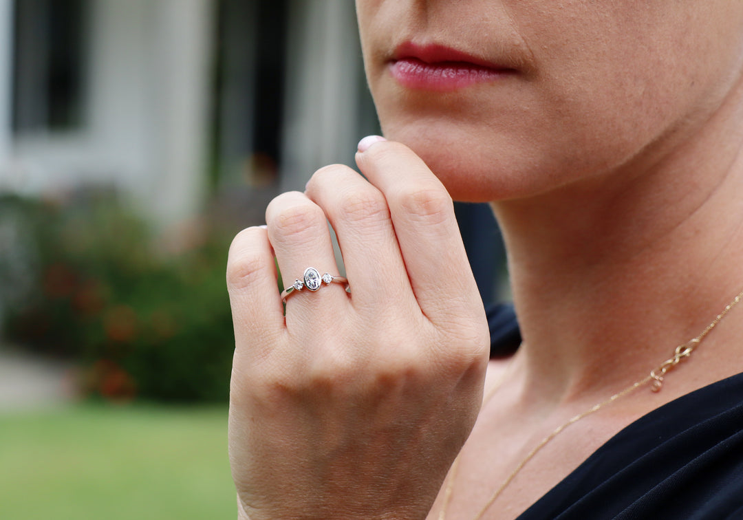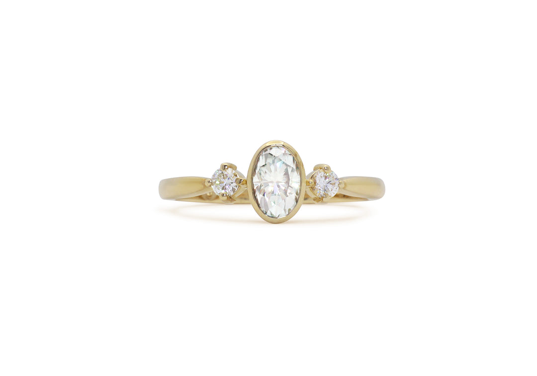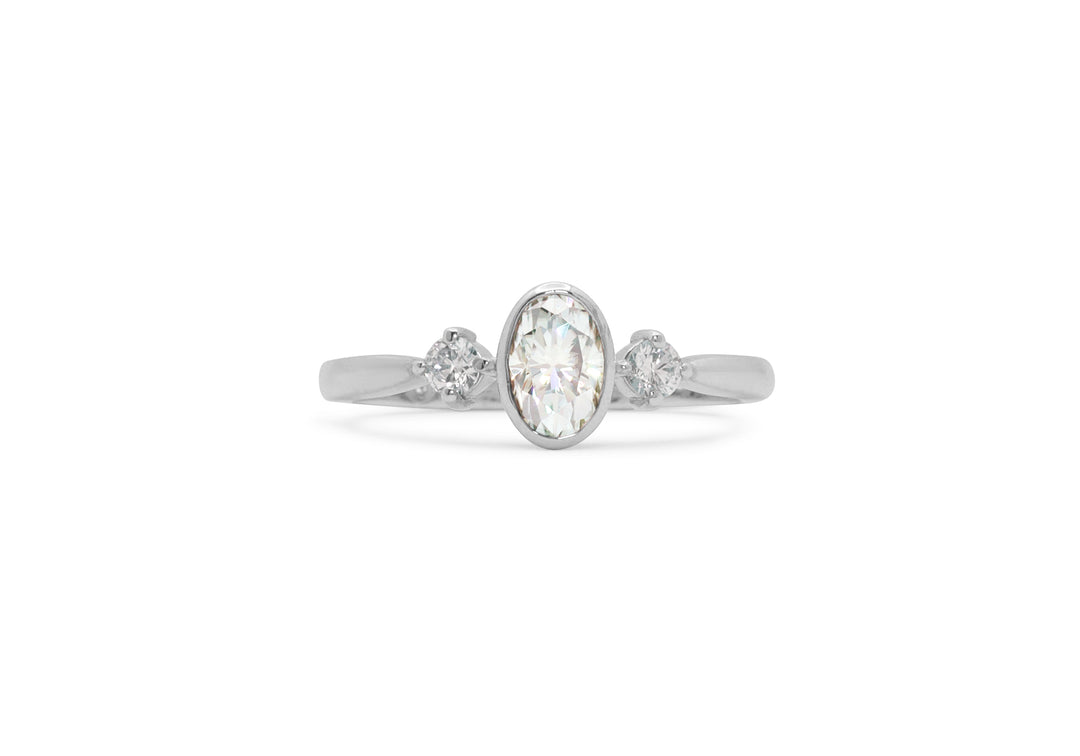 - Engagement ring with 6 x 4 mm oval center in closed setting.