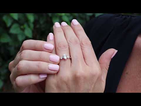 - Two 3 mm stones are mounted on claws on either side of the central stone.