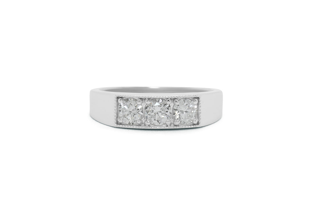 - Ring with 3 diamonds mounted on prongs in a rectangular cavity.