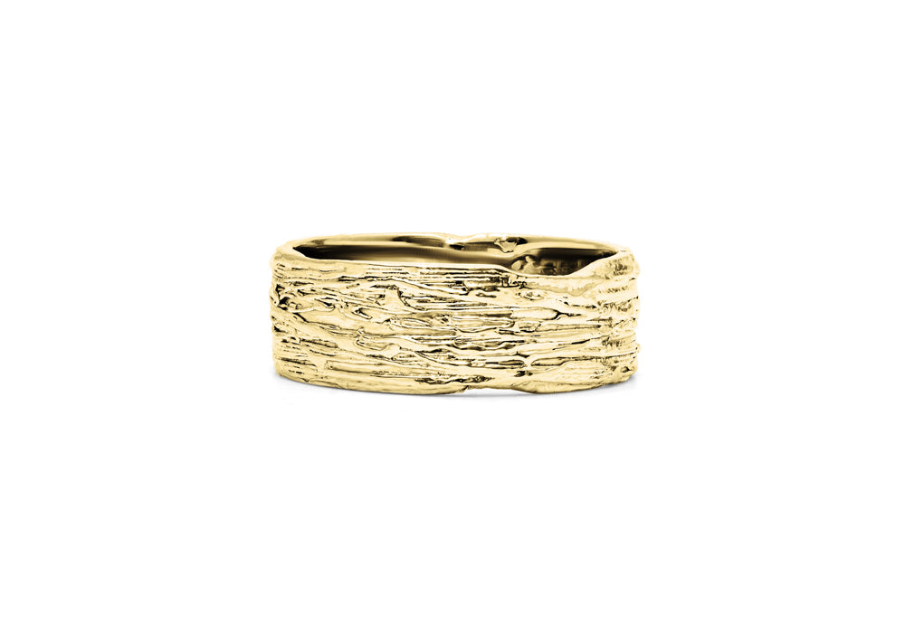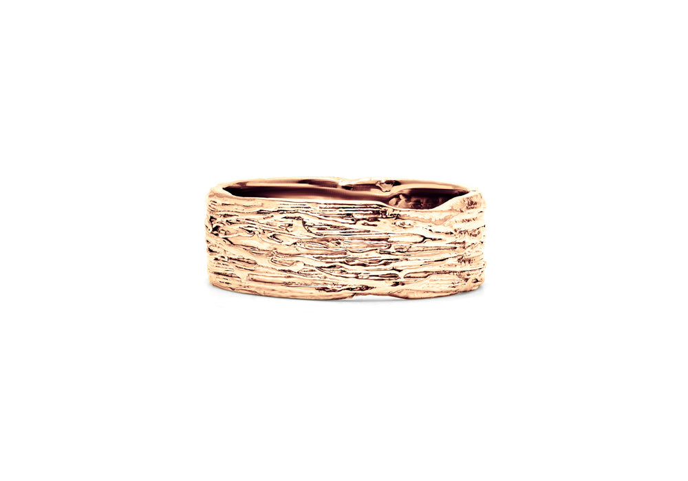 - A band for men with a texture reminiscent of wood bark .