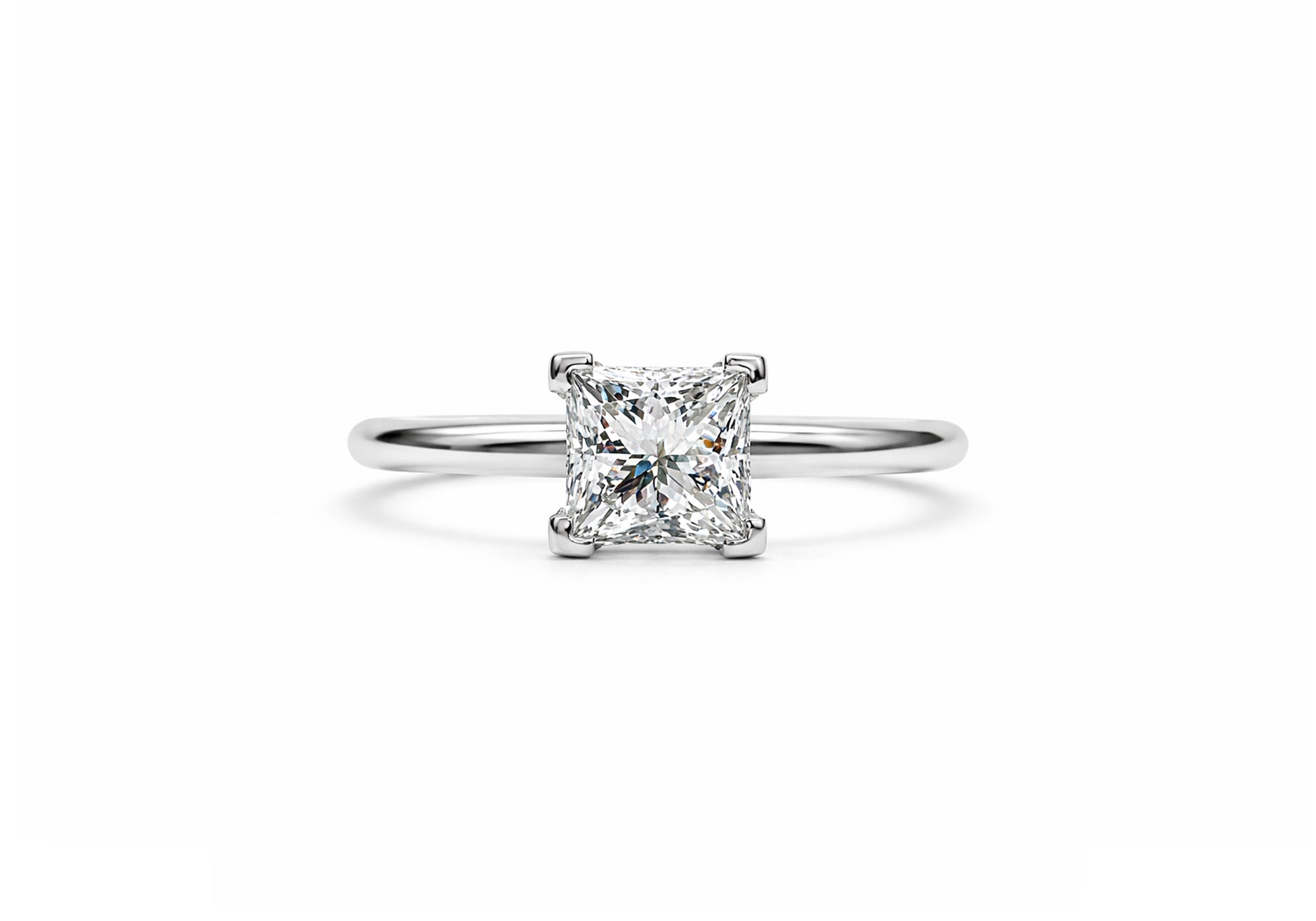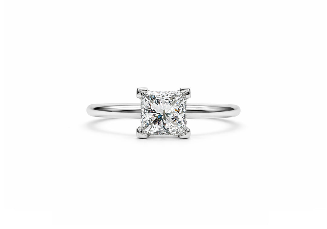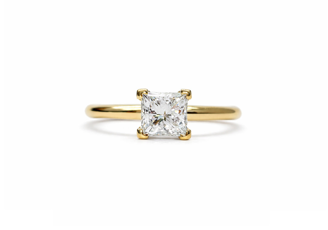 - Solitaire with princess cut diamond supported by 4 square prongs.