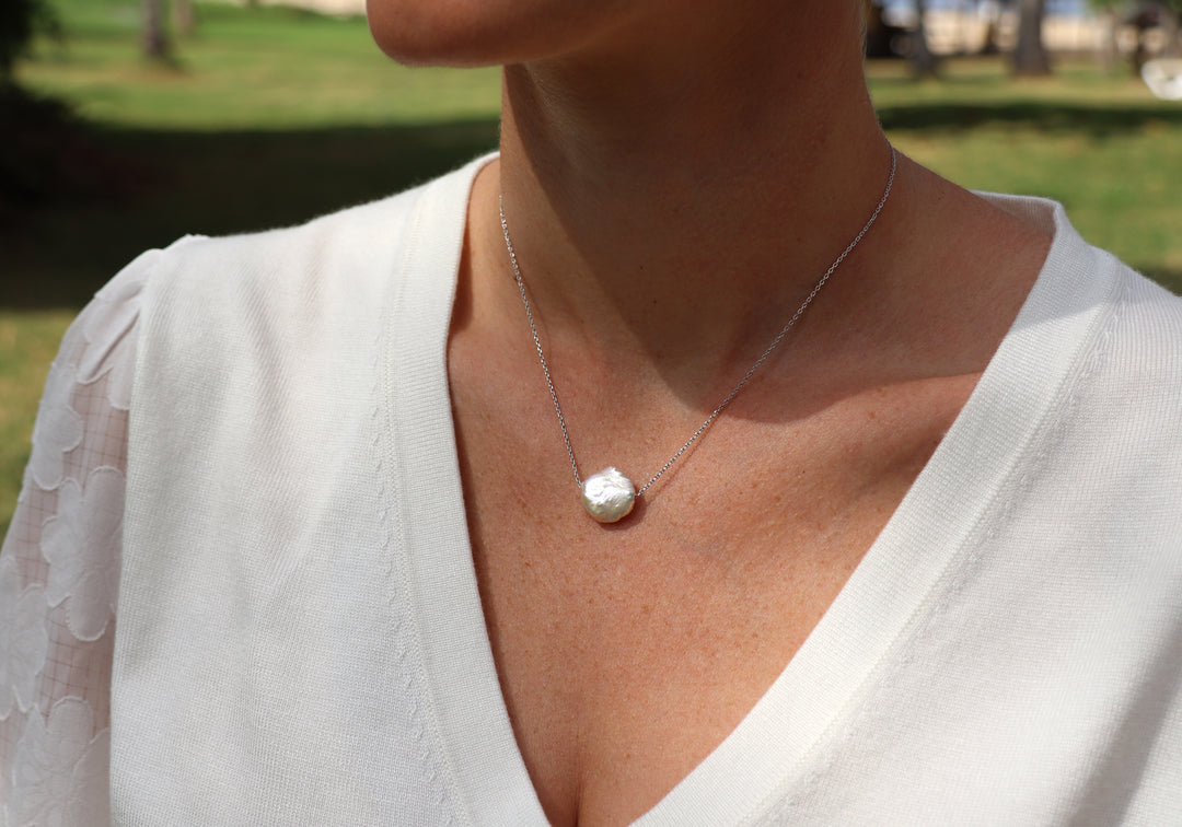 - A Tiffany-style Chain in sterling silver crosses the pearl in perfect balance.