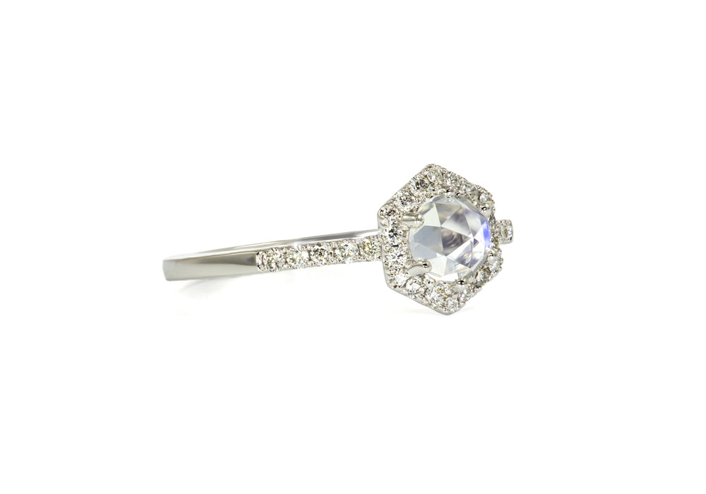 - Semi-eternity engagement ring with a rose cut moonstone center.