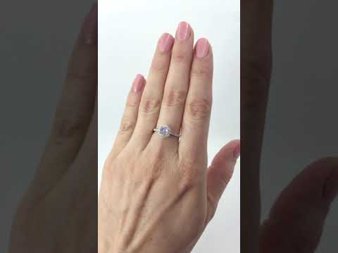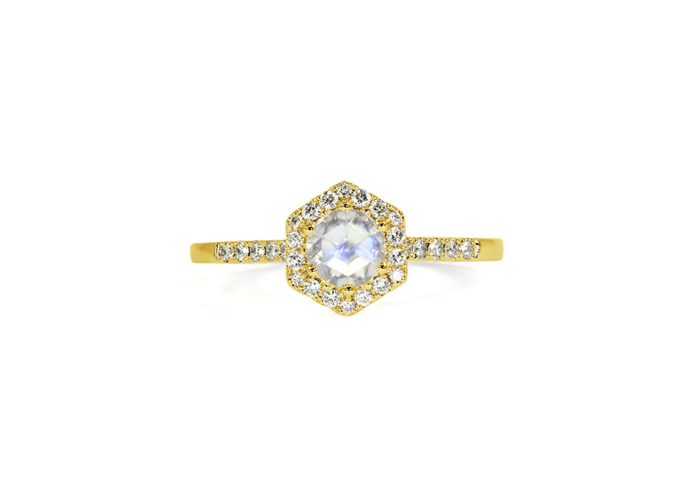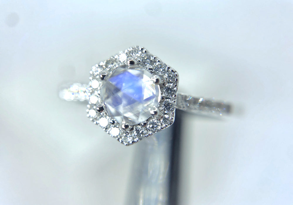 - The moonstone has silver and bluish highlights and is surrounded by a hexagonal halo of 18 diamonds.
