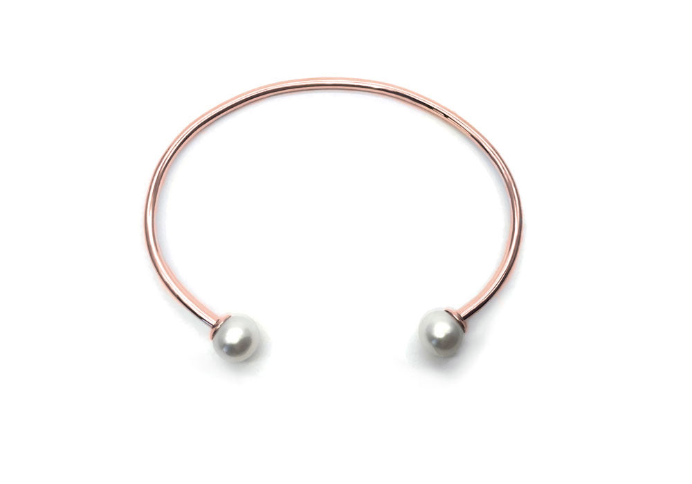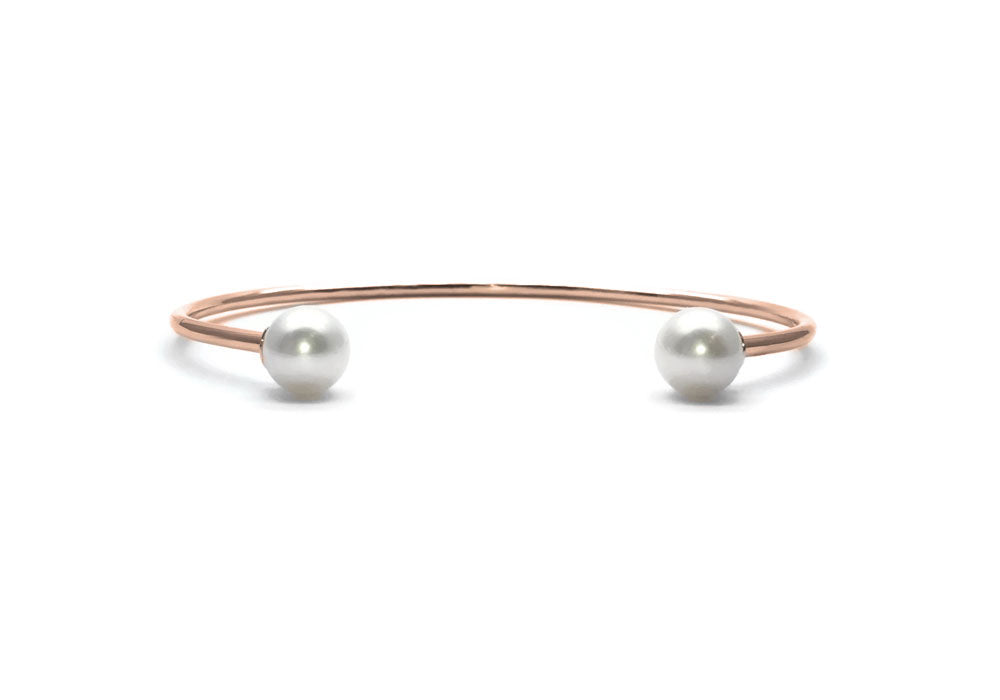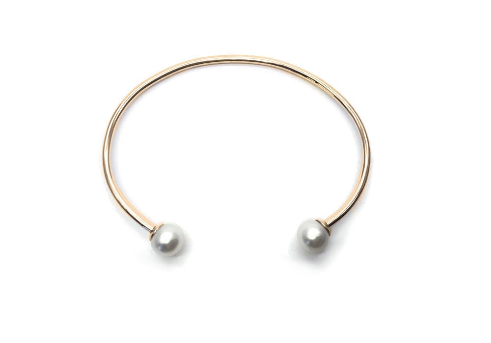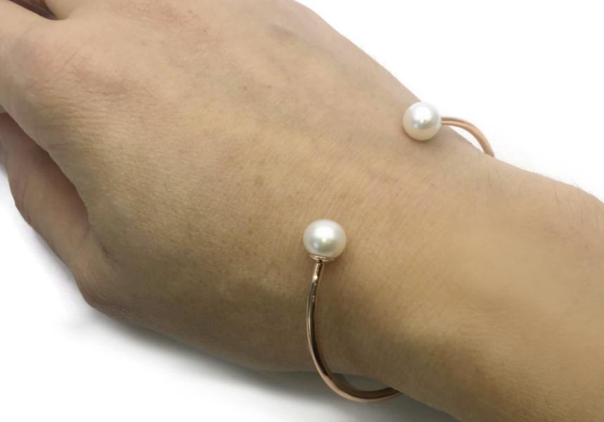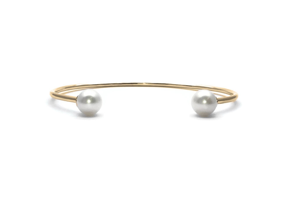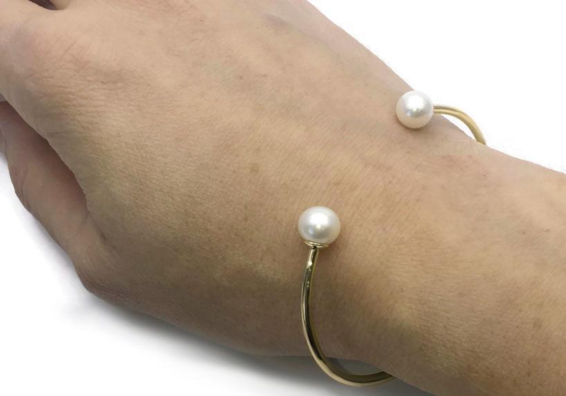 Gold bracelet with two 7.5 mm white pearls.