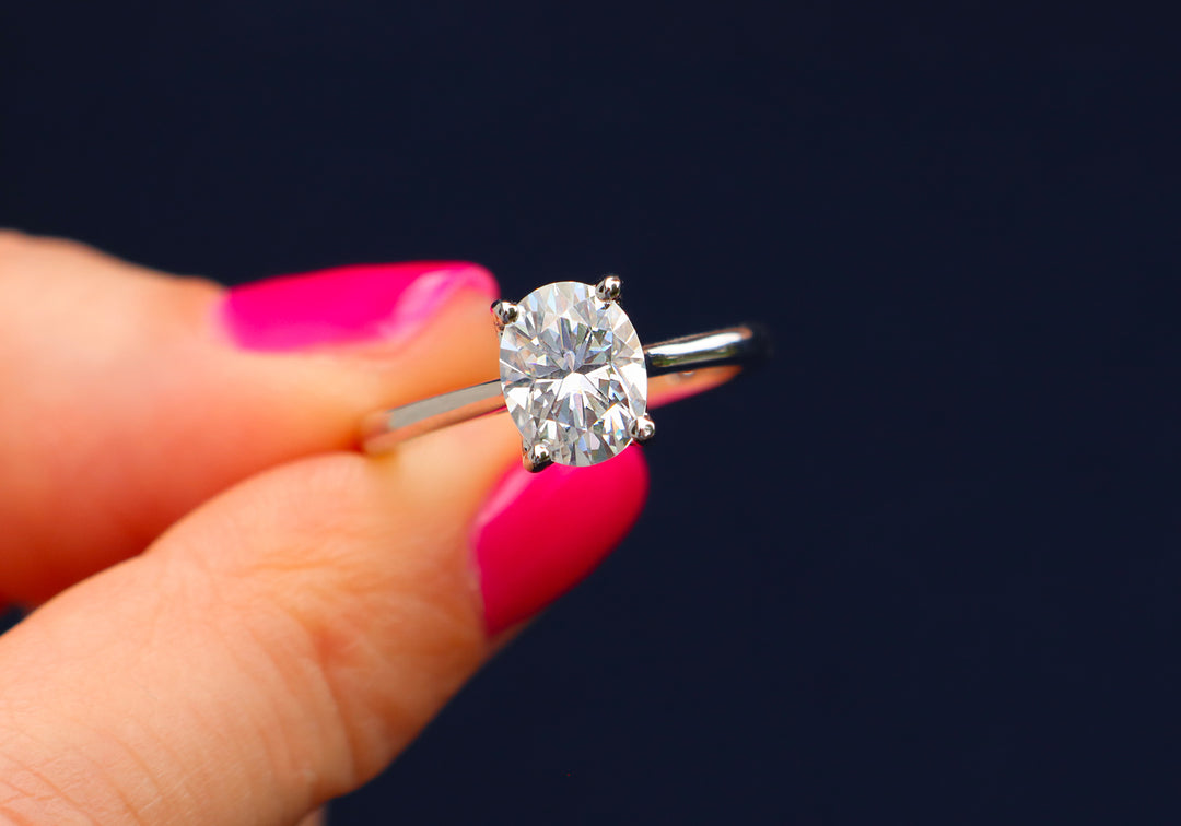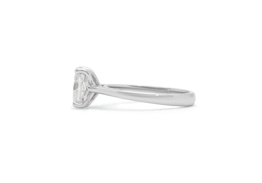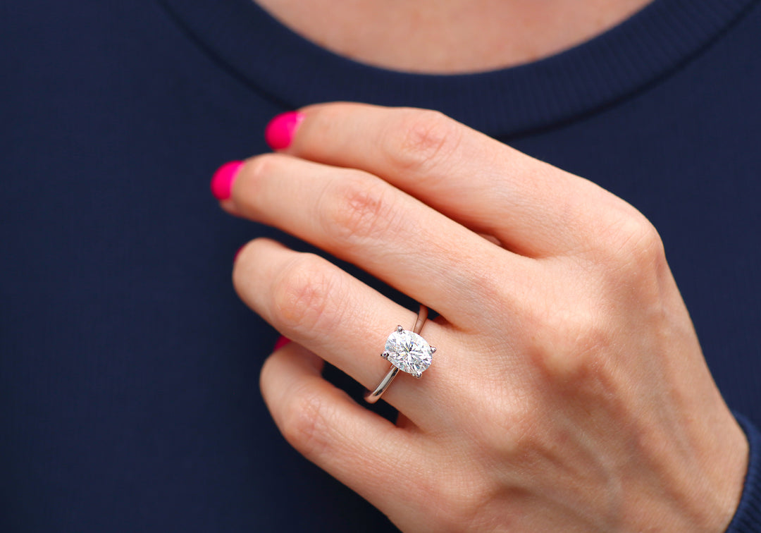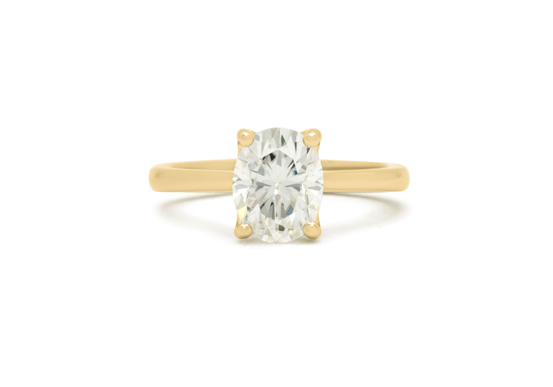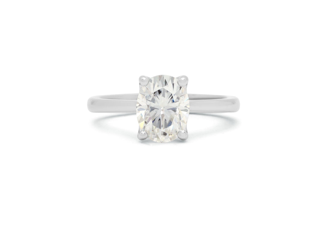 • Classic solitaire with 9 x 7 mm oval diamond set on prongs.