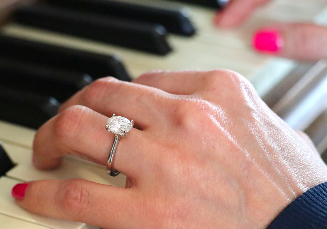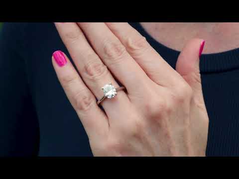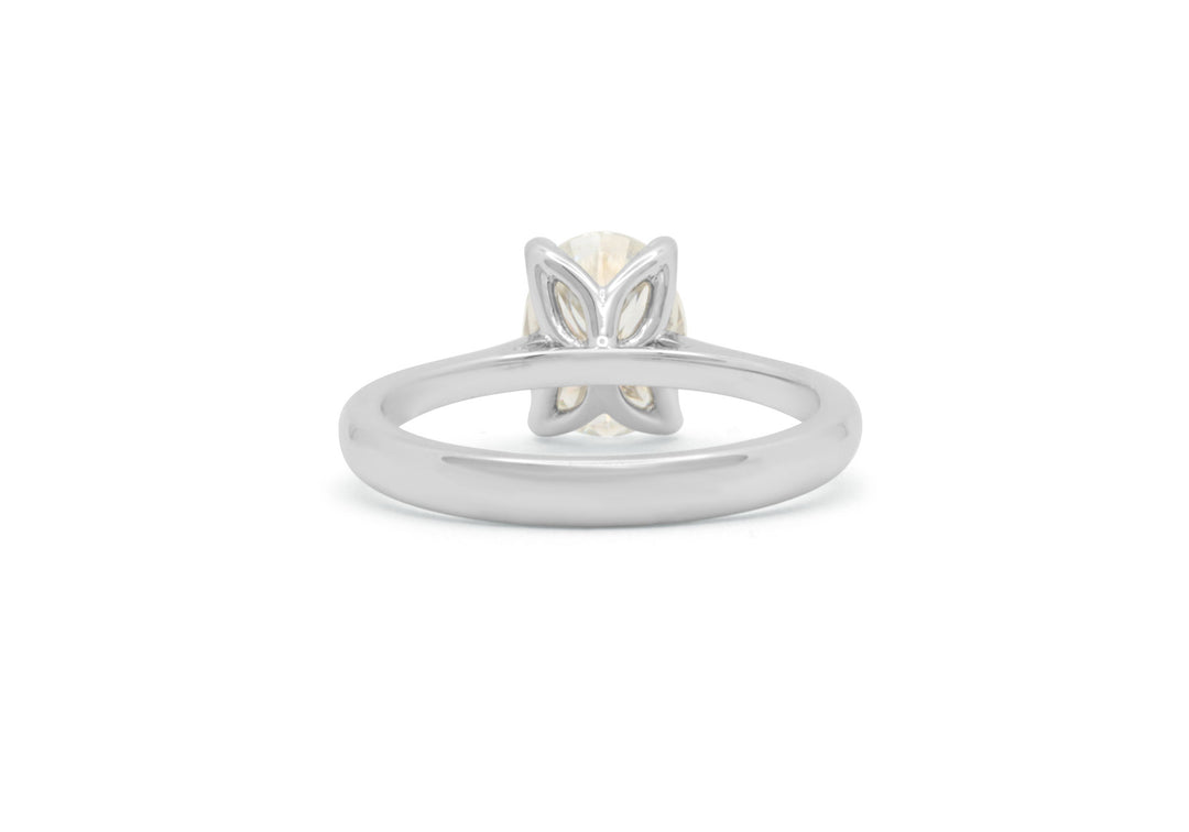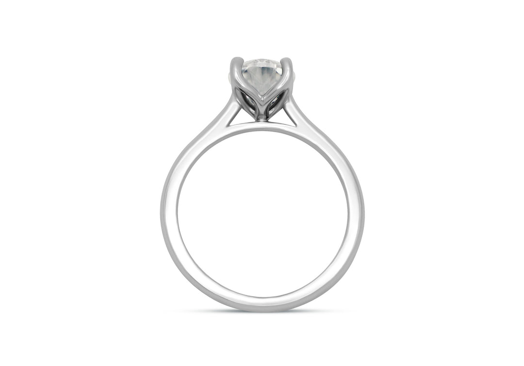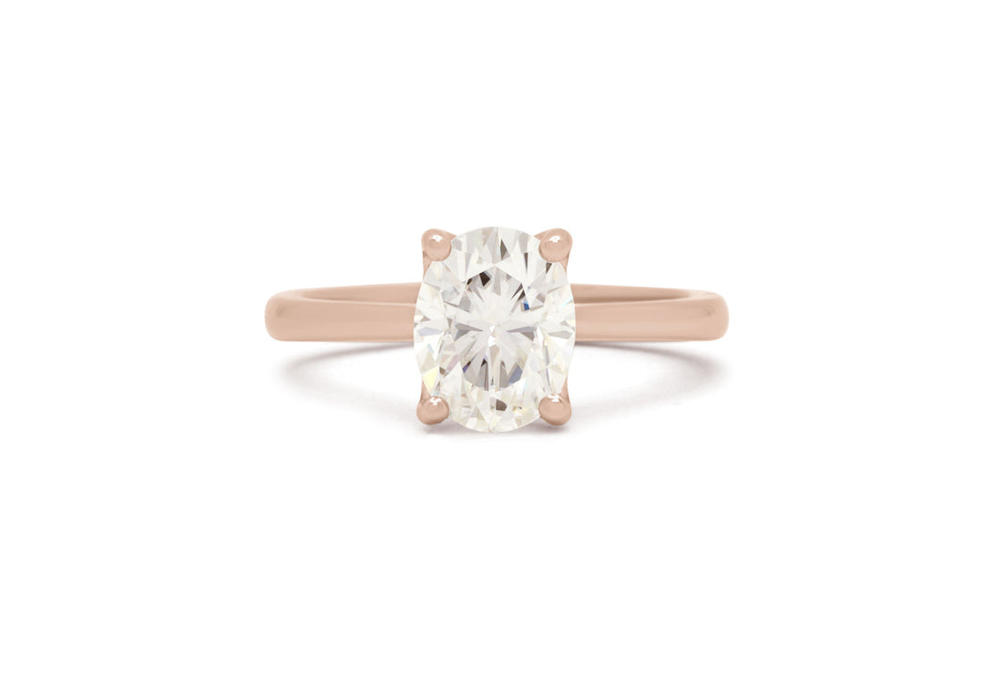 • Classic solitaire with 9 x 7 mm oval diamond set on prongs.