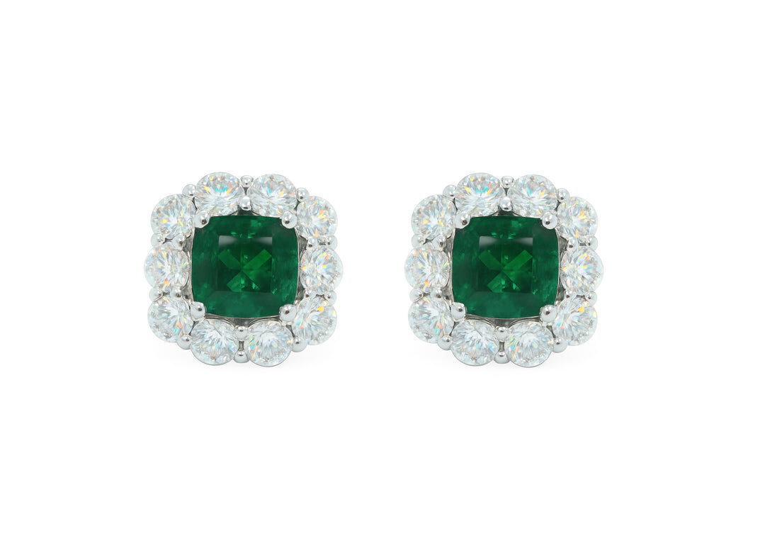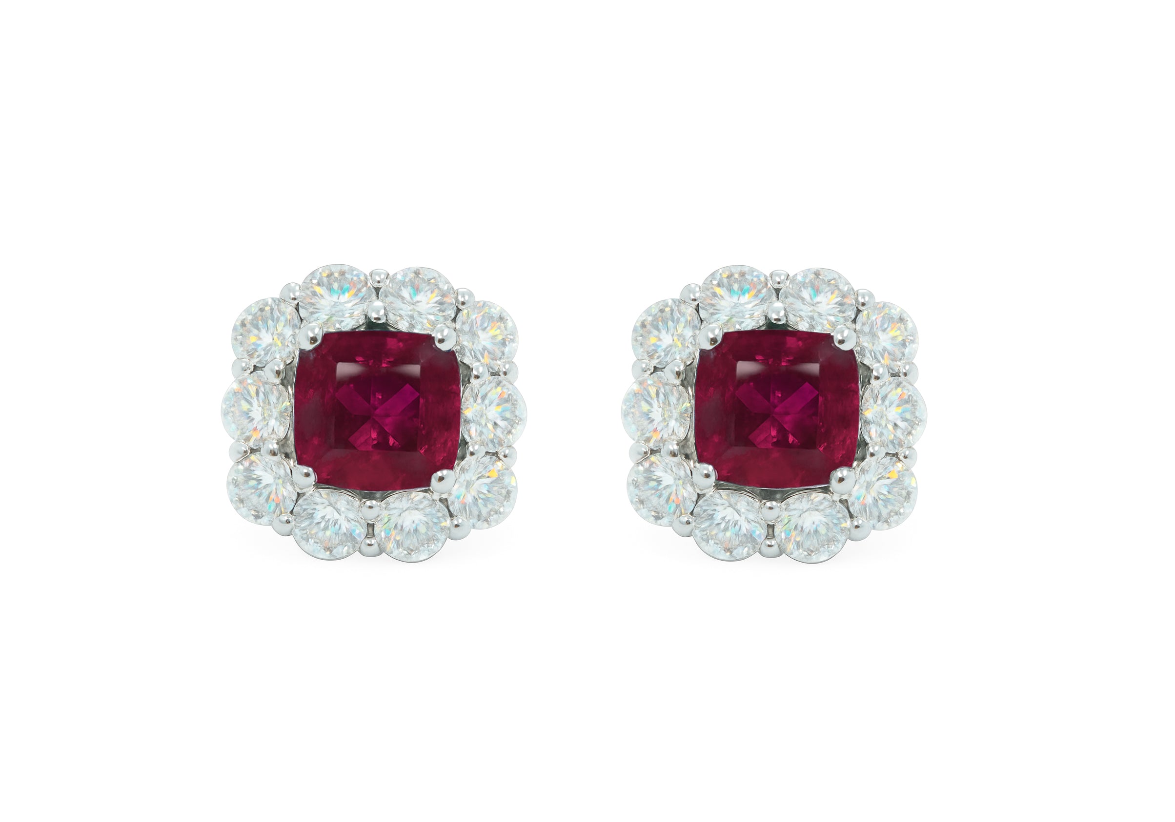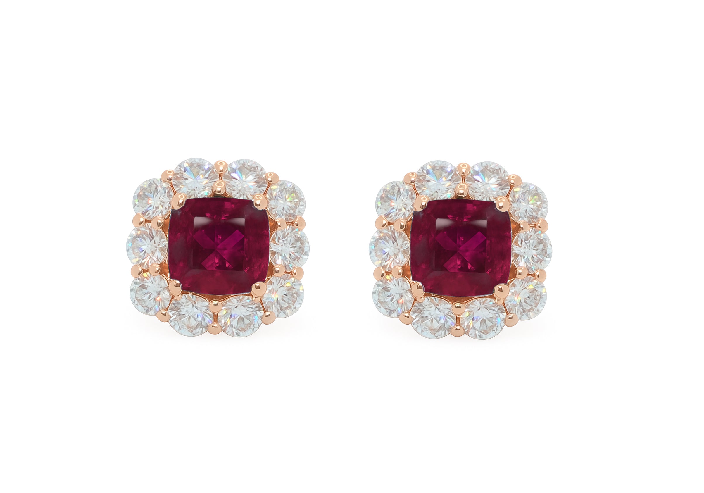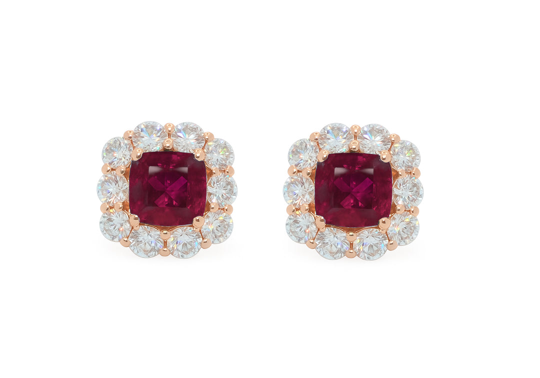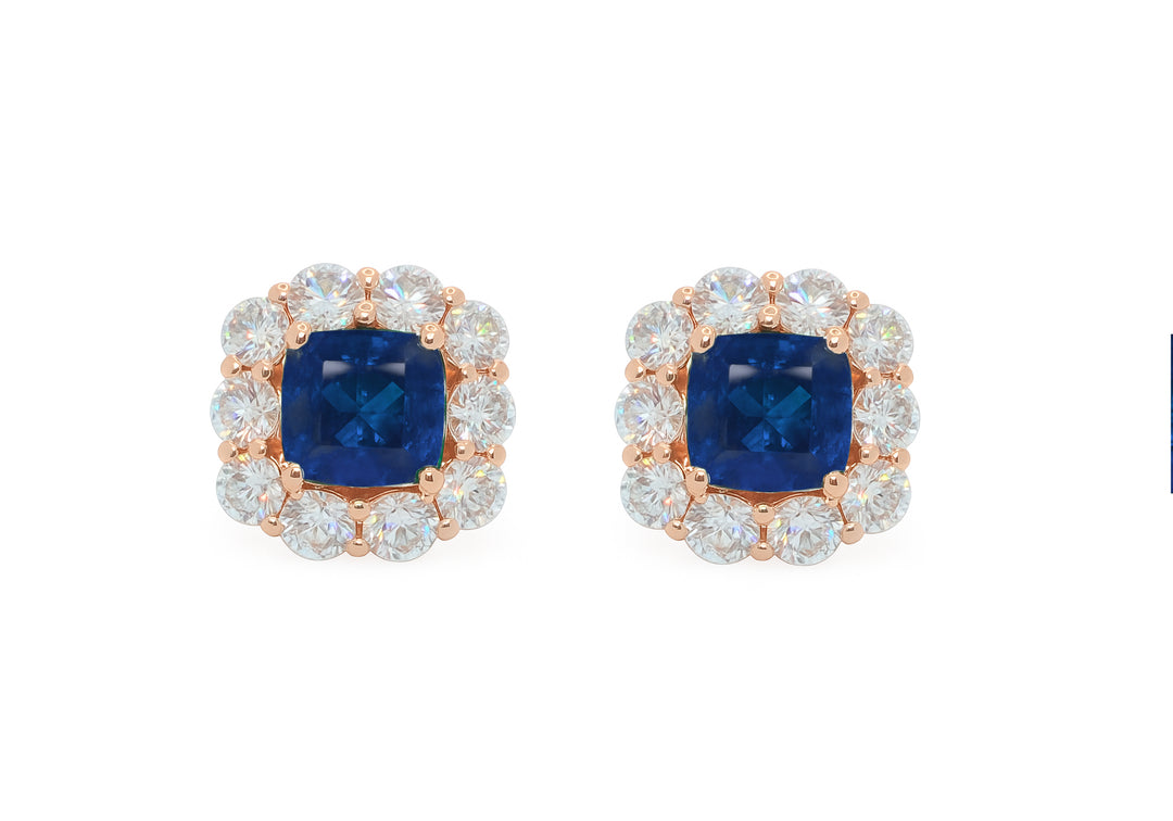 - Earrings with 6mm cushion-cut semi-precious stones surrounded by diamonds.