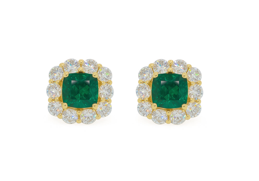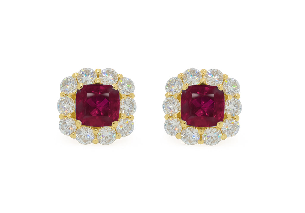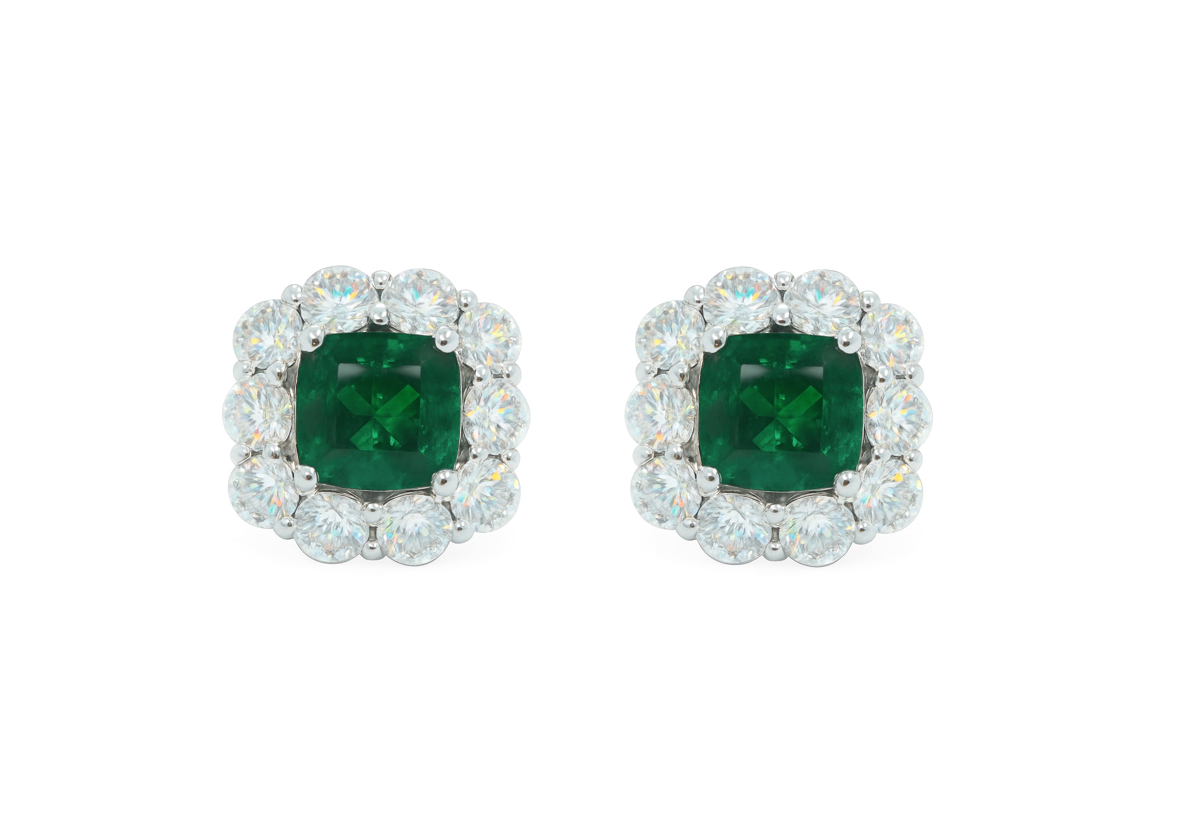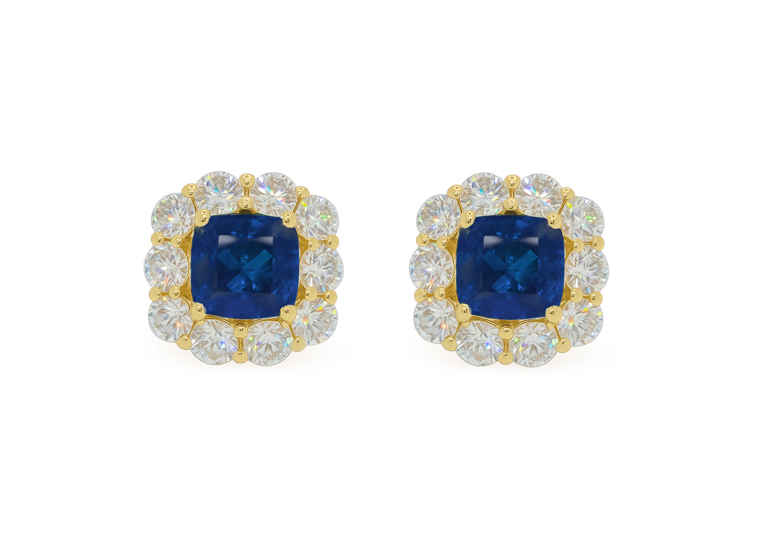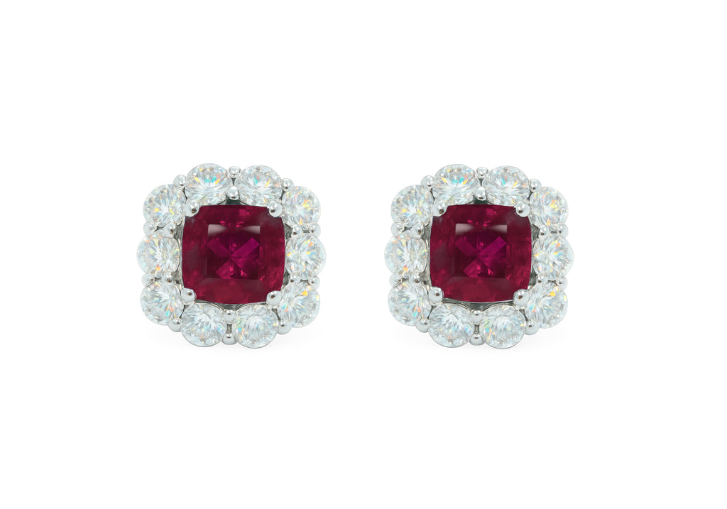 - Earrings with 6mm cushion-cut semi-precious stones surrounded by diamonds.