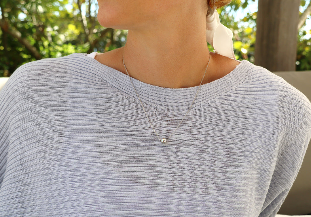 • The ball is pierced and strung loosely on a delicate sterling silver chain.