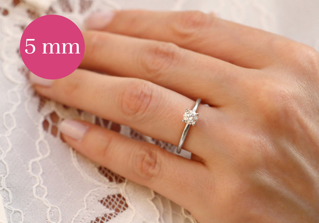 - 5mm Moissanite set in the center with 4 prongs.