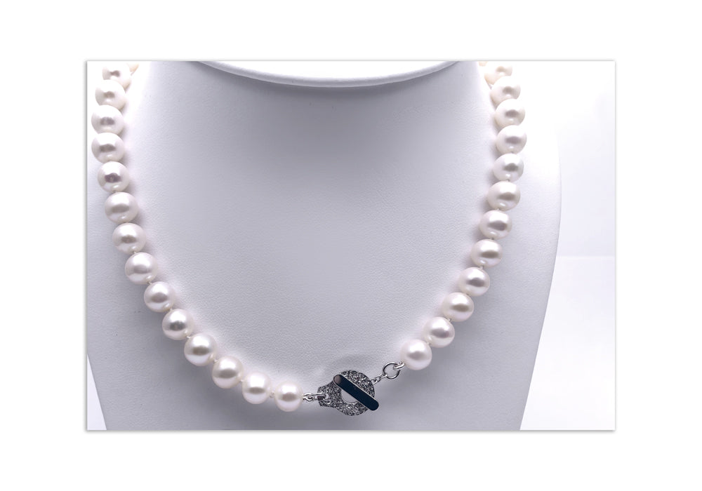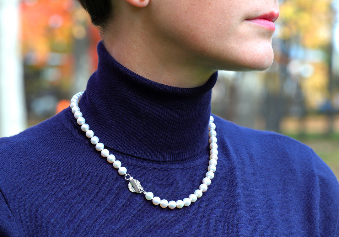 - Strung on a satin string with knots in between each pearl, making it very solid and resistant.