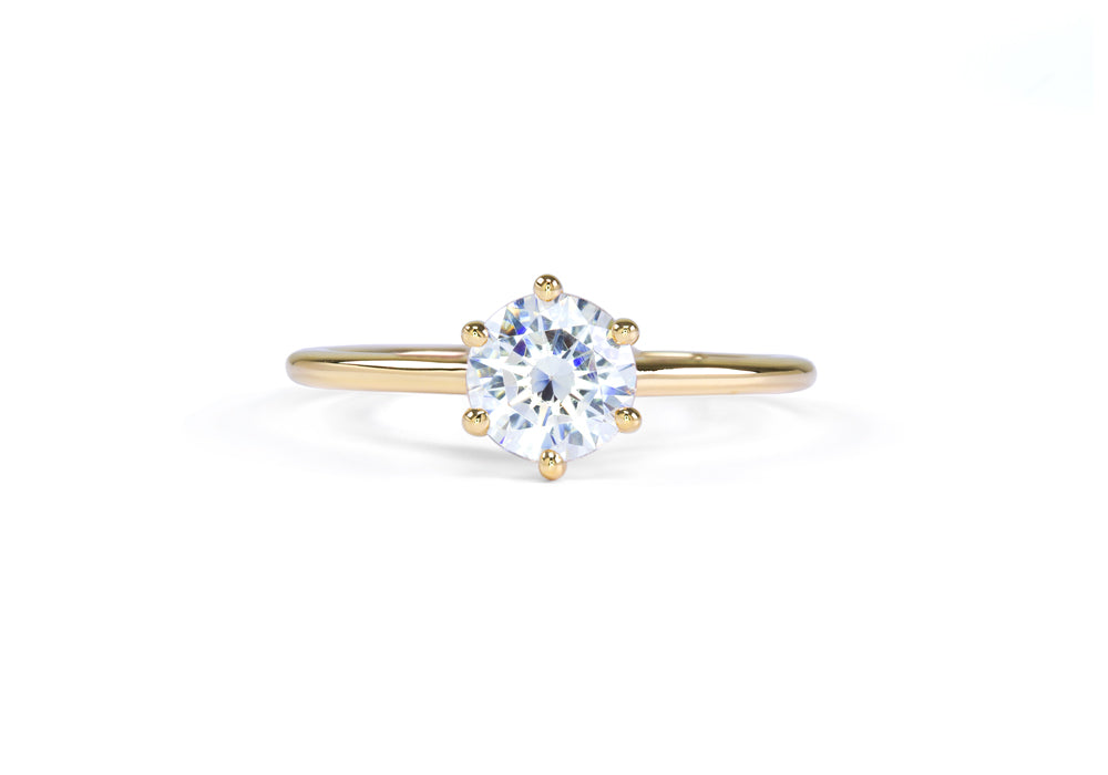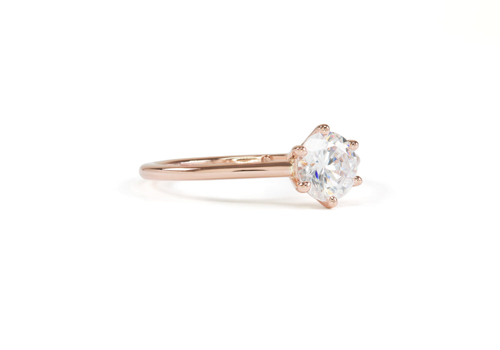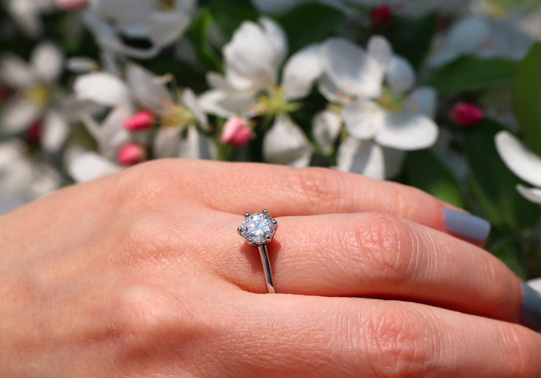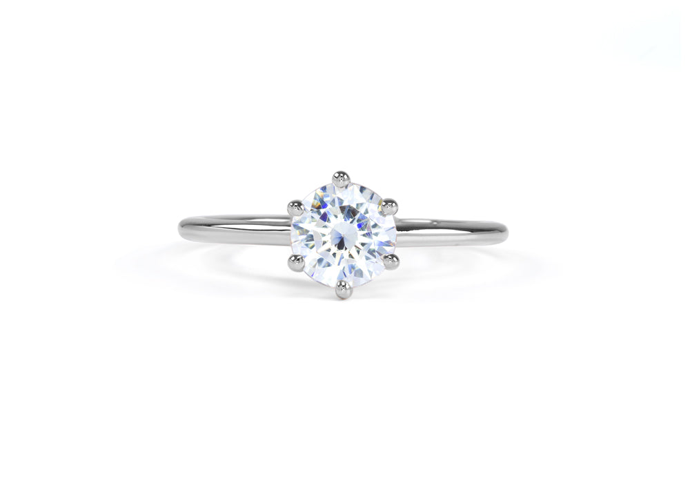 - 1 ct lab-created moissanite or diamond set in 6 prongs.