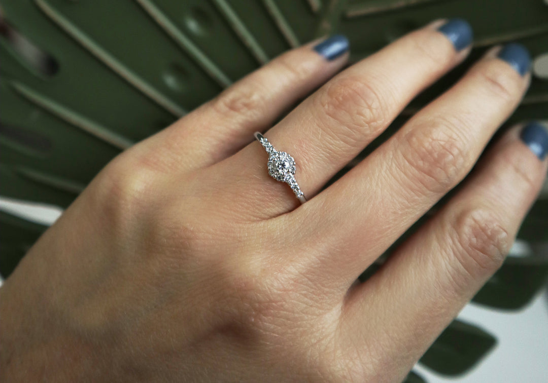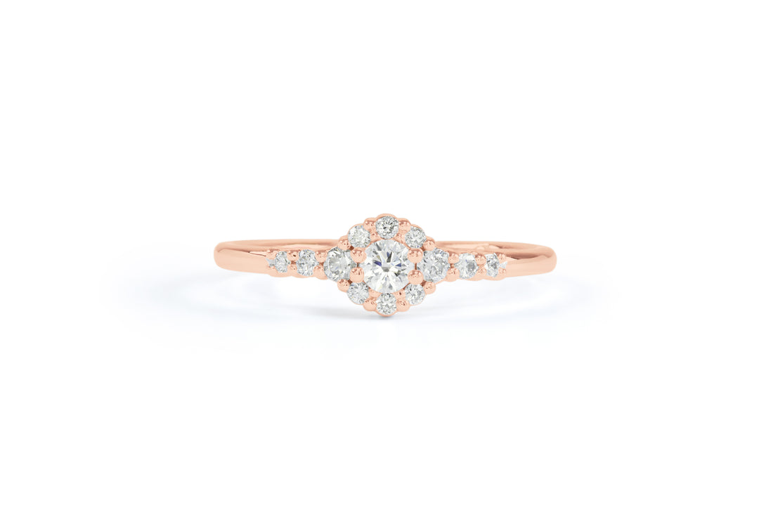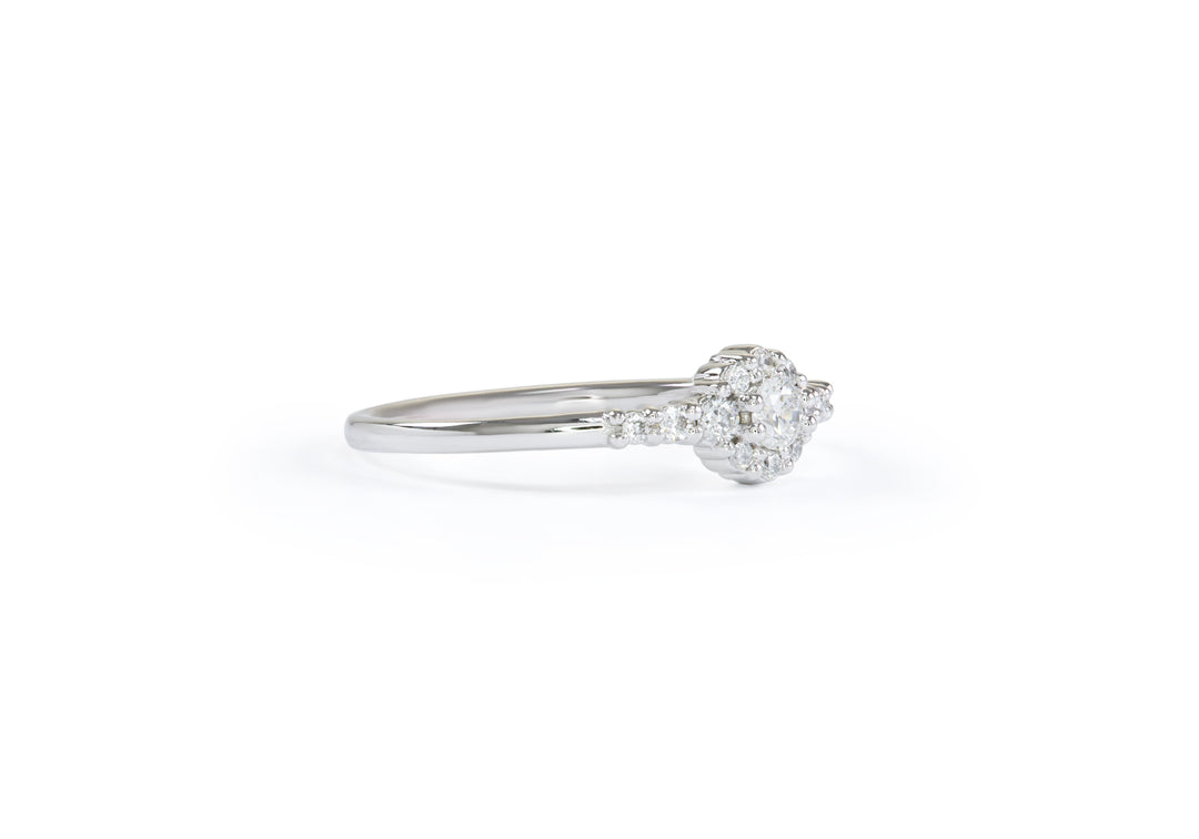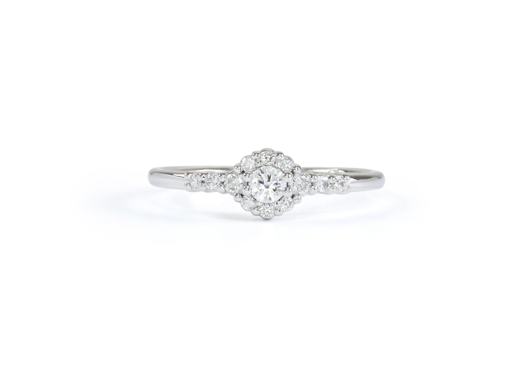 - A halo of diamonds enhances the 0.10ct center diamond.