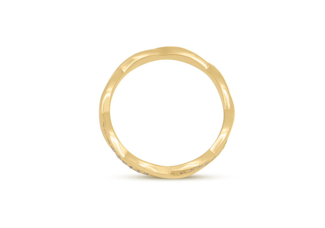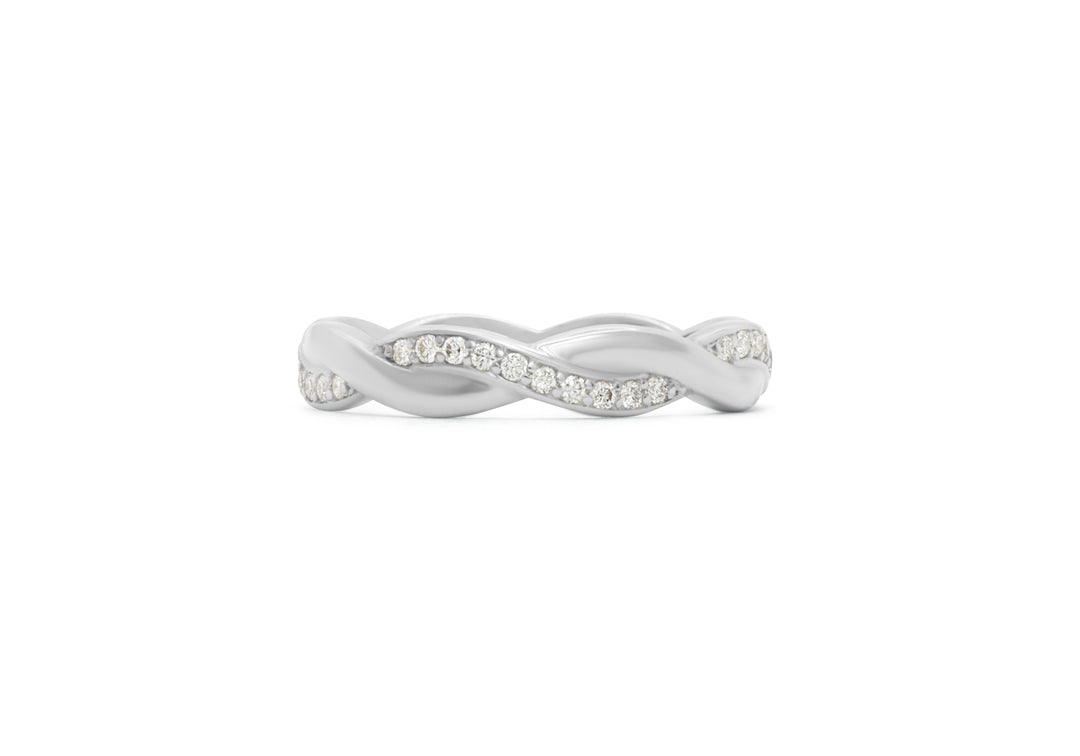 - A pavé of small diamonds follows the curve of one of the wires all around the ring.