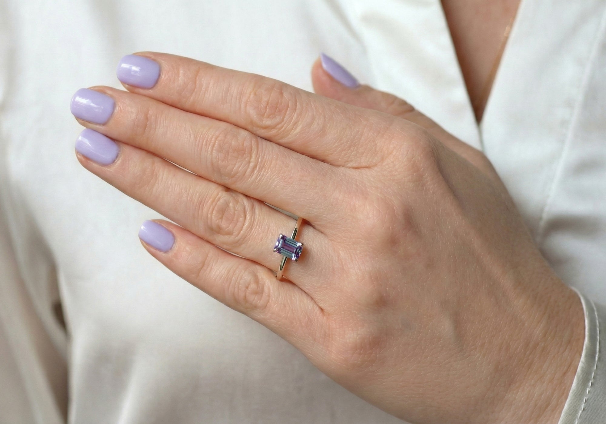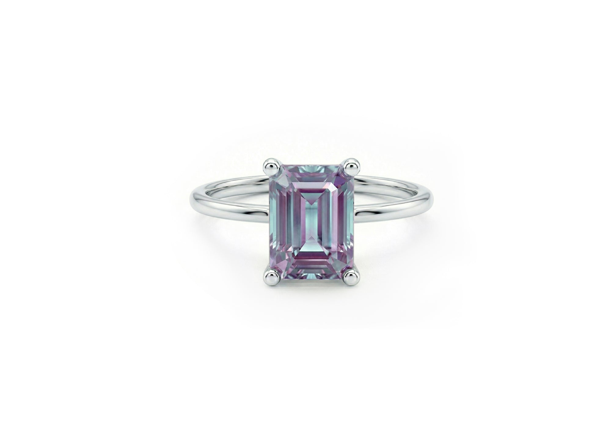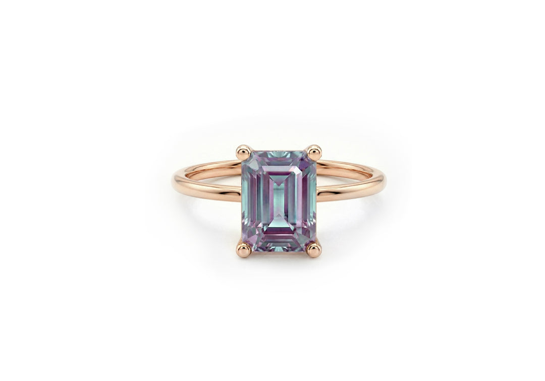 - Solitaire with an emerald-cut lab-created alexandrite.