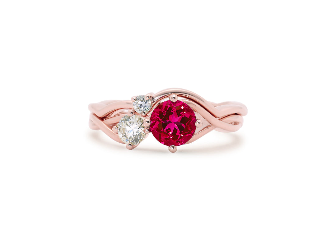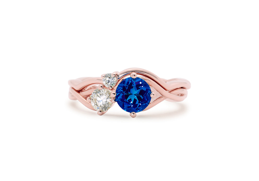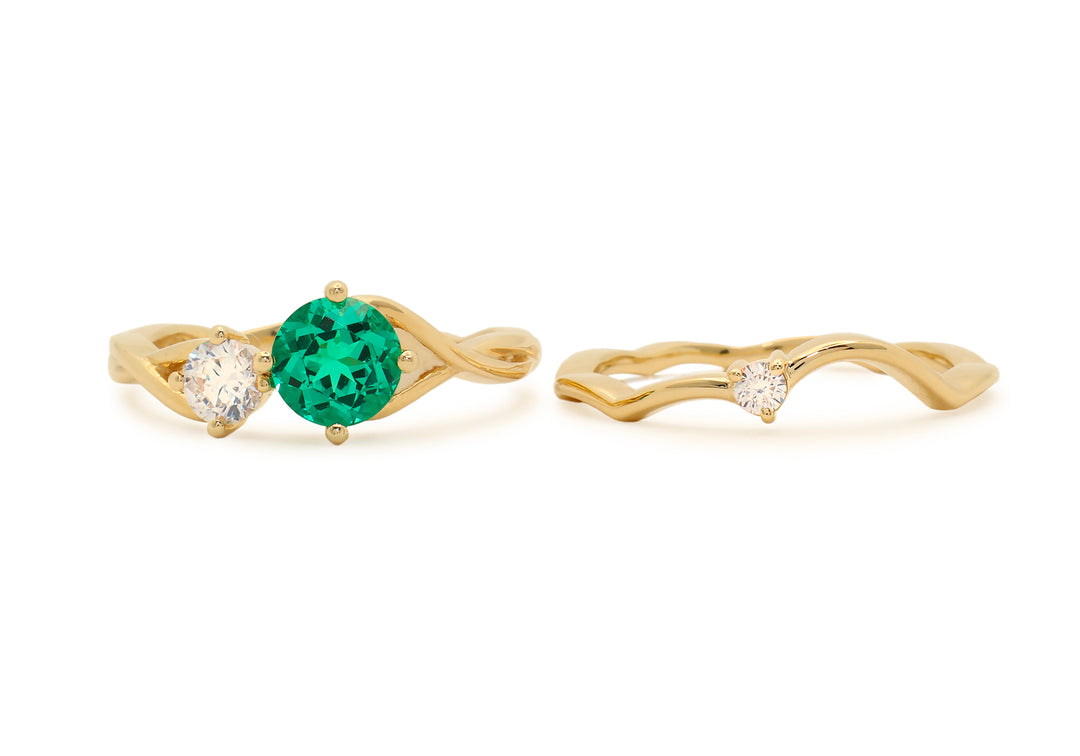 • The curved wedding band features a small diamond that nestles between the two stones of the engagement ring.