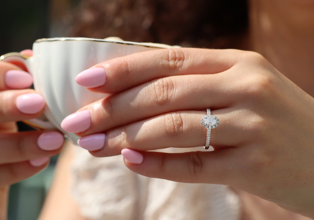 • The central diamond is of oval cut surrounded by a halo.