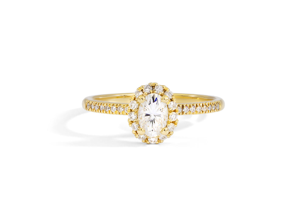 Gold engagement ring with central oval diamond surrounded by a halo.