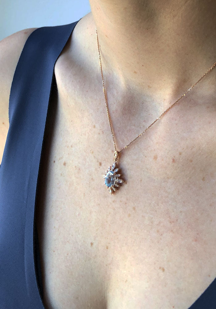 - Oval blue topaz of 9 x 7 mm in the center of this rose gold pendant.