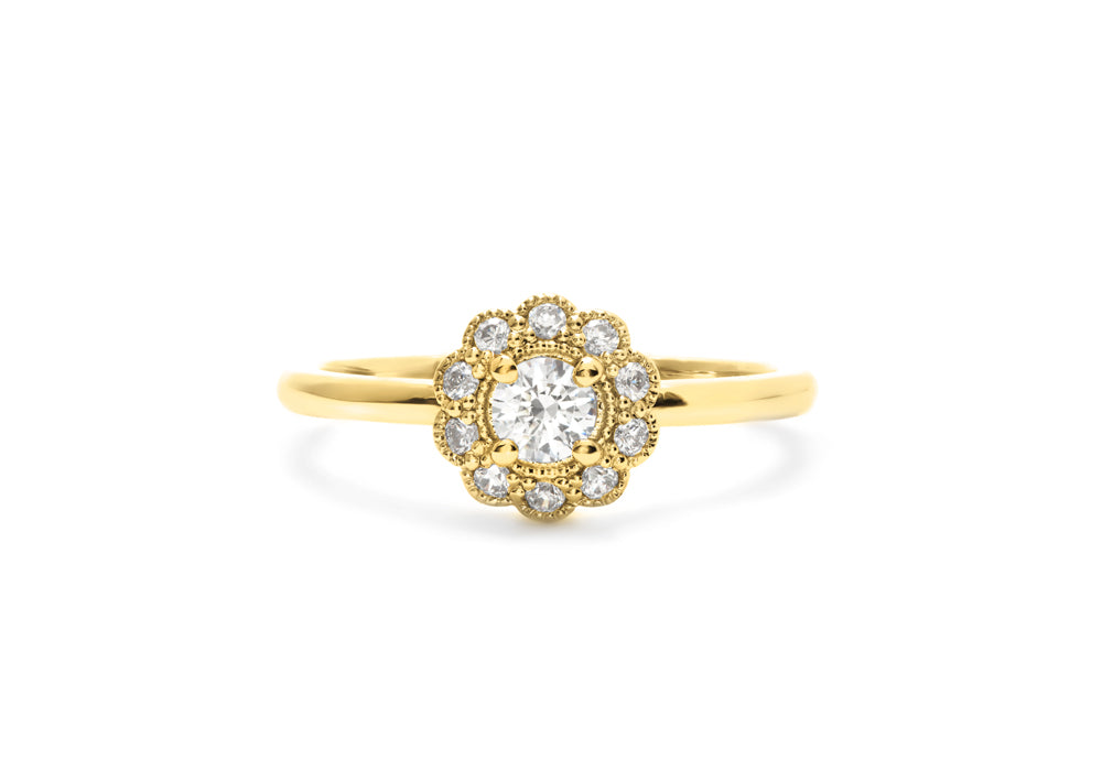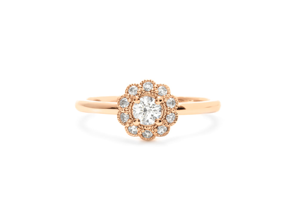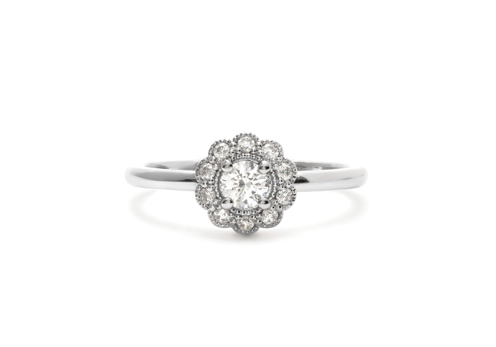 - A 4 mm diamond is encircled by a flower of 10 diamonds.
