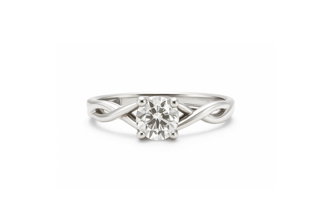 Women's ring with the infinity symbol set with a moissanite stone.