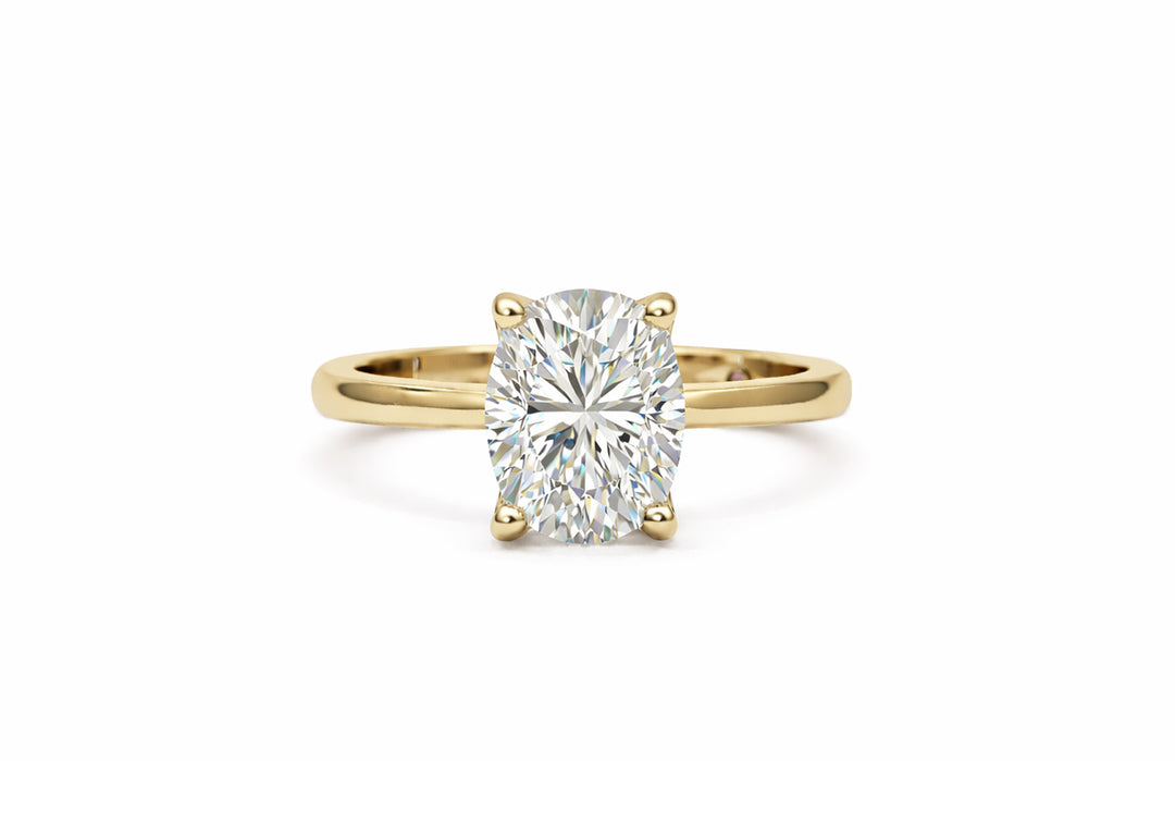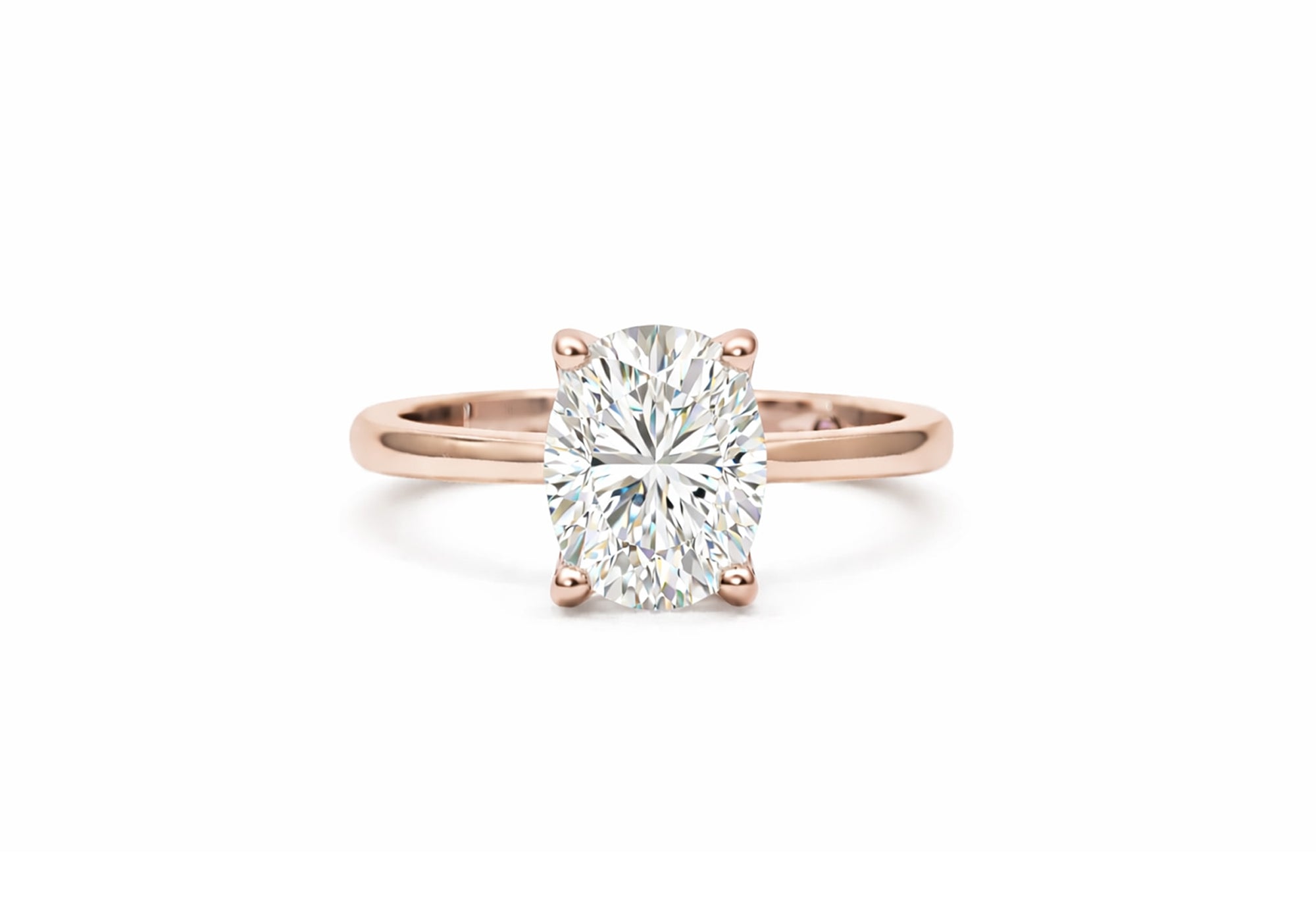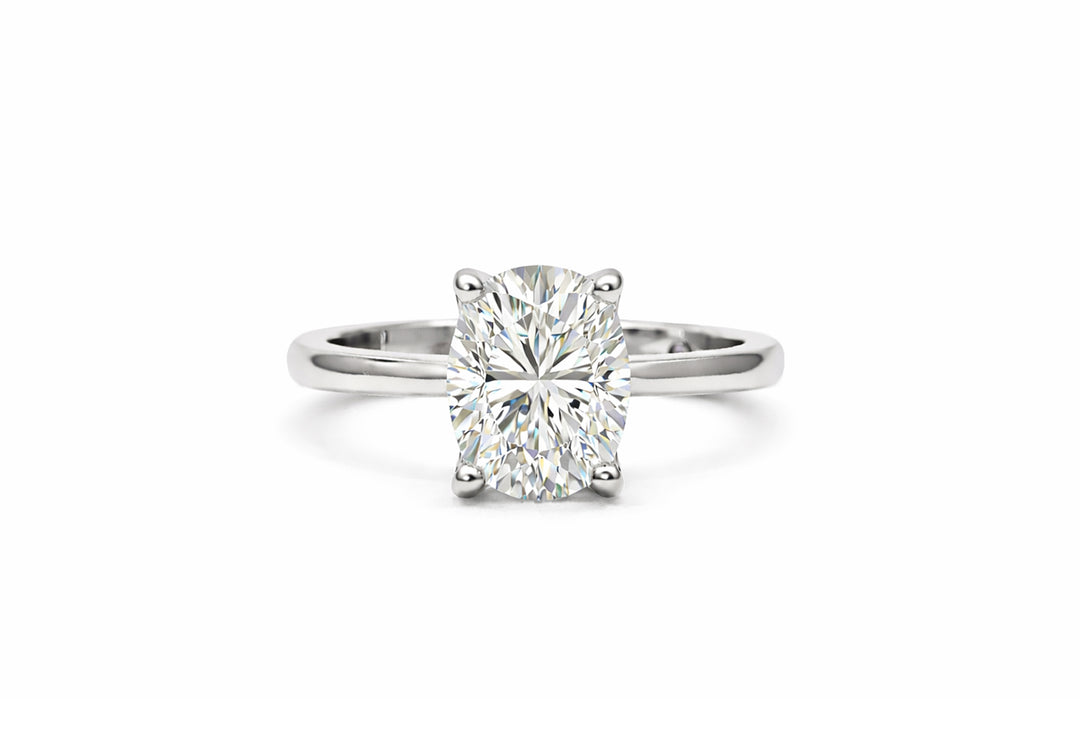 - Classic solitaire with 9 x 7 mm oval diamond set on prongs.