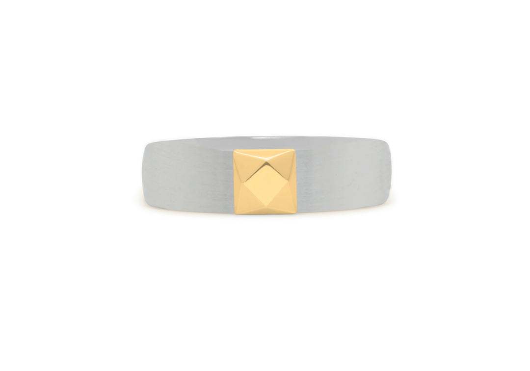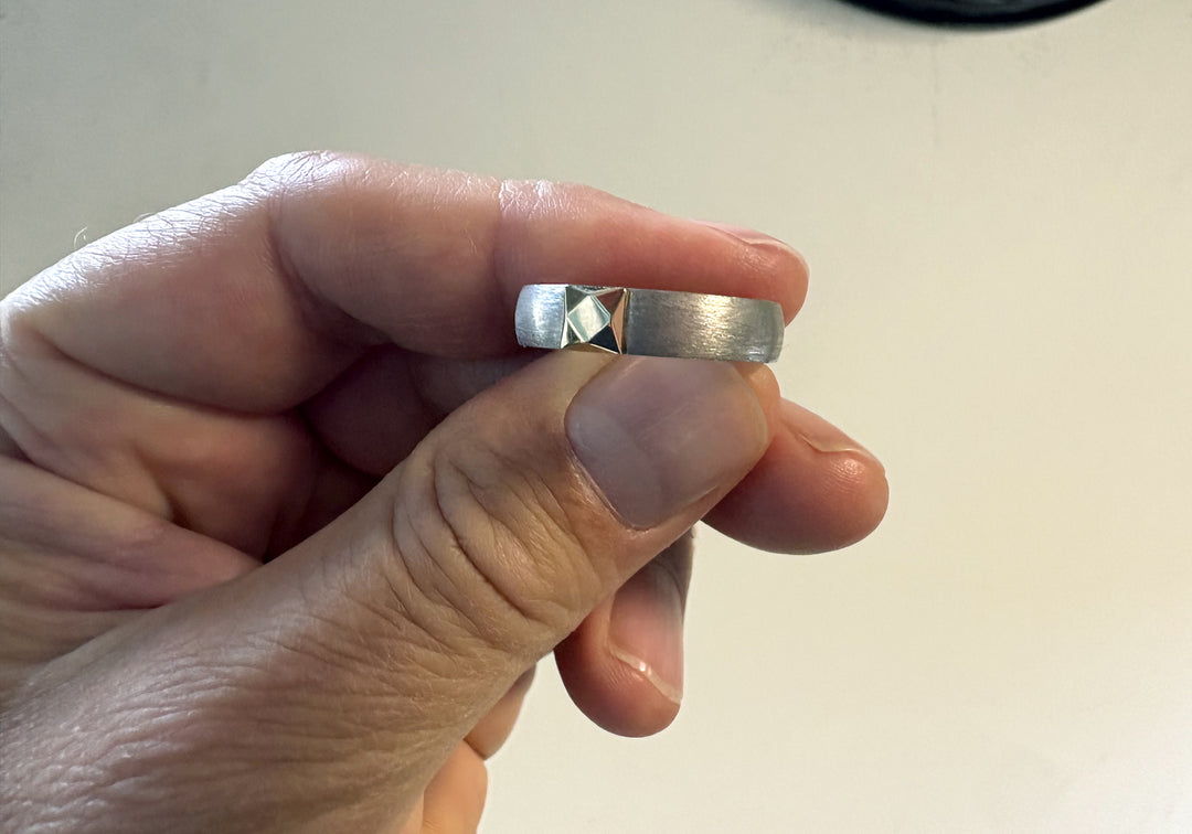 Men's band with faceted stone in gold.