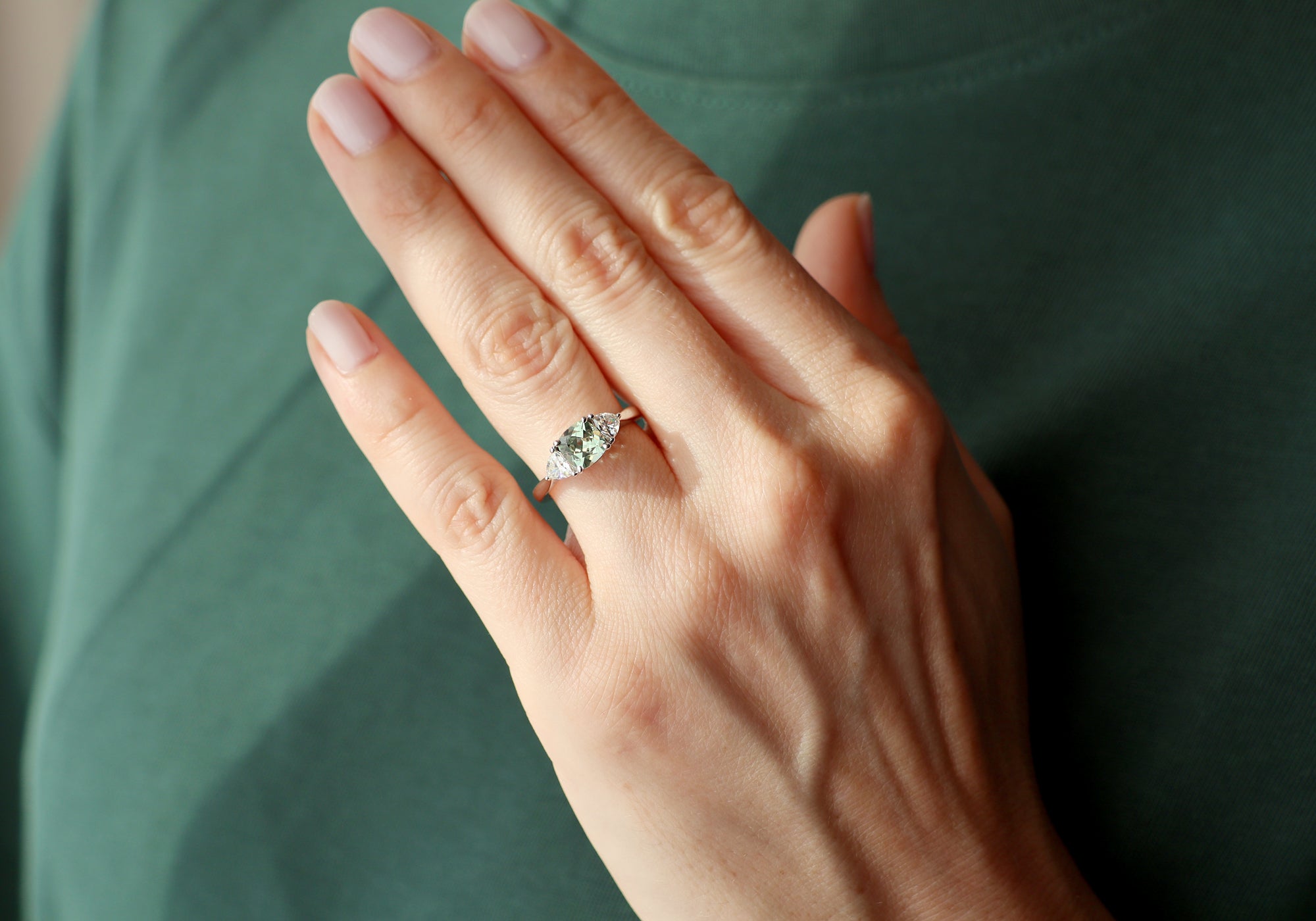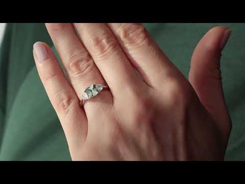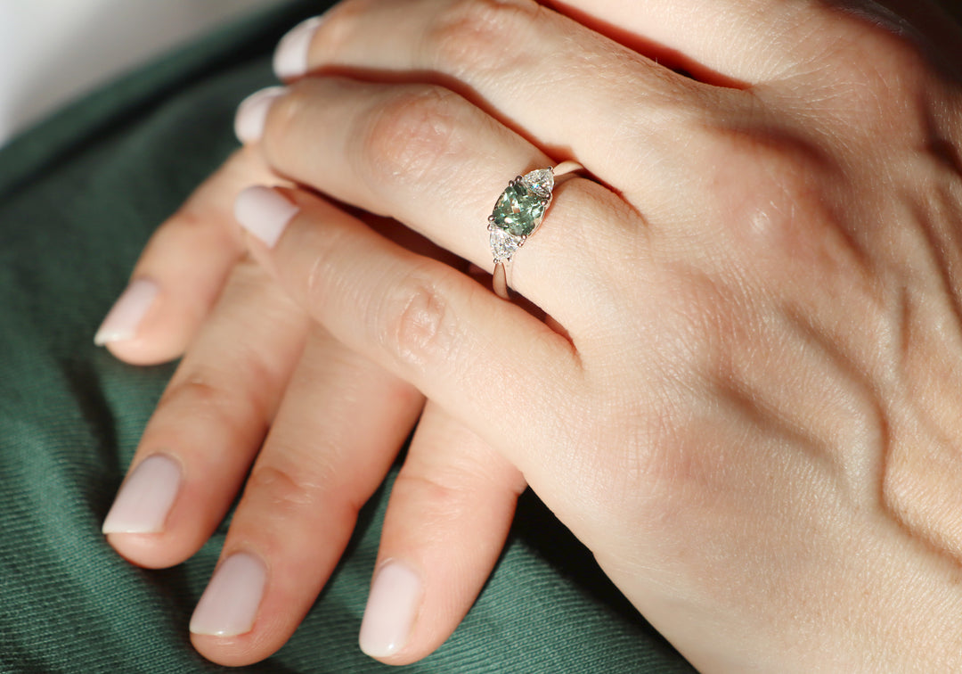 - The center stone is a lab-grown green sapphire.