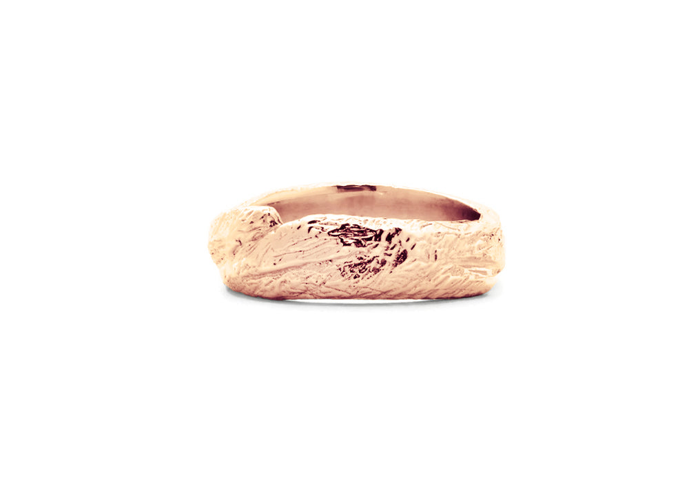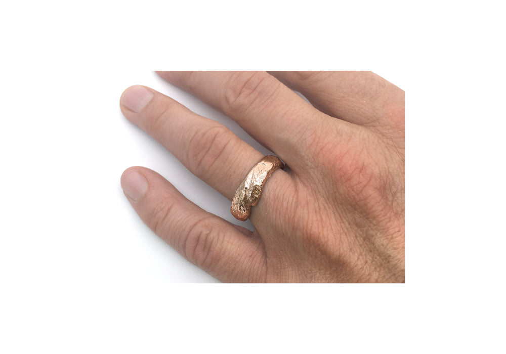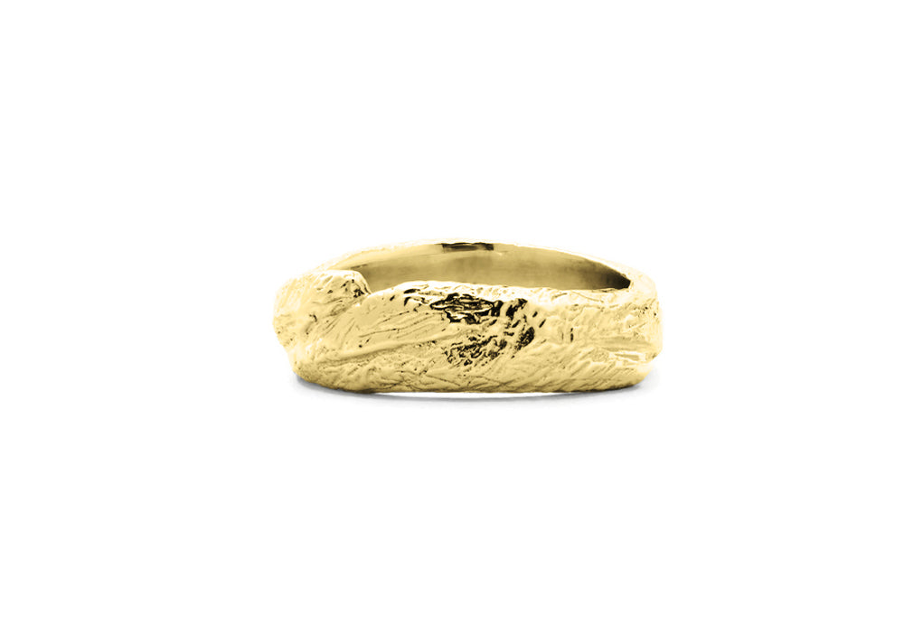 - Gold band for men with an organic texture reminiscent of bark.