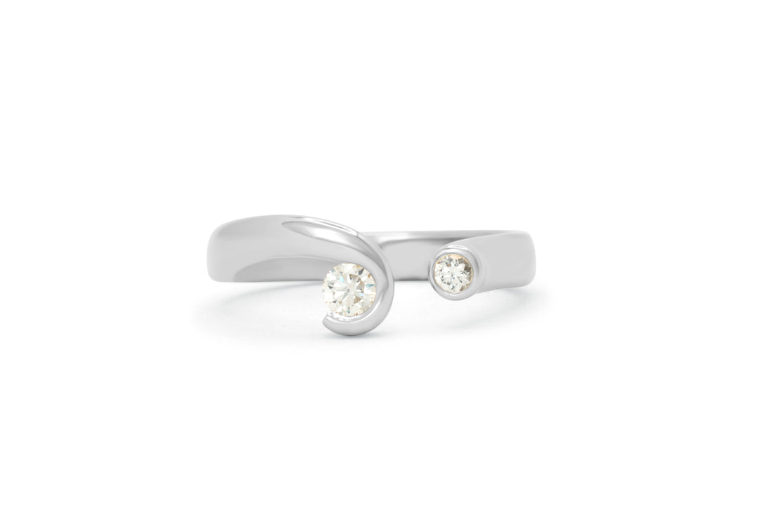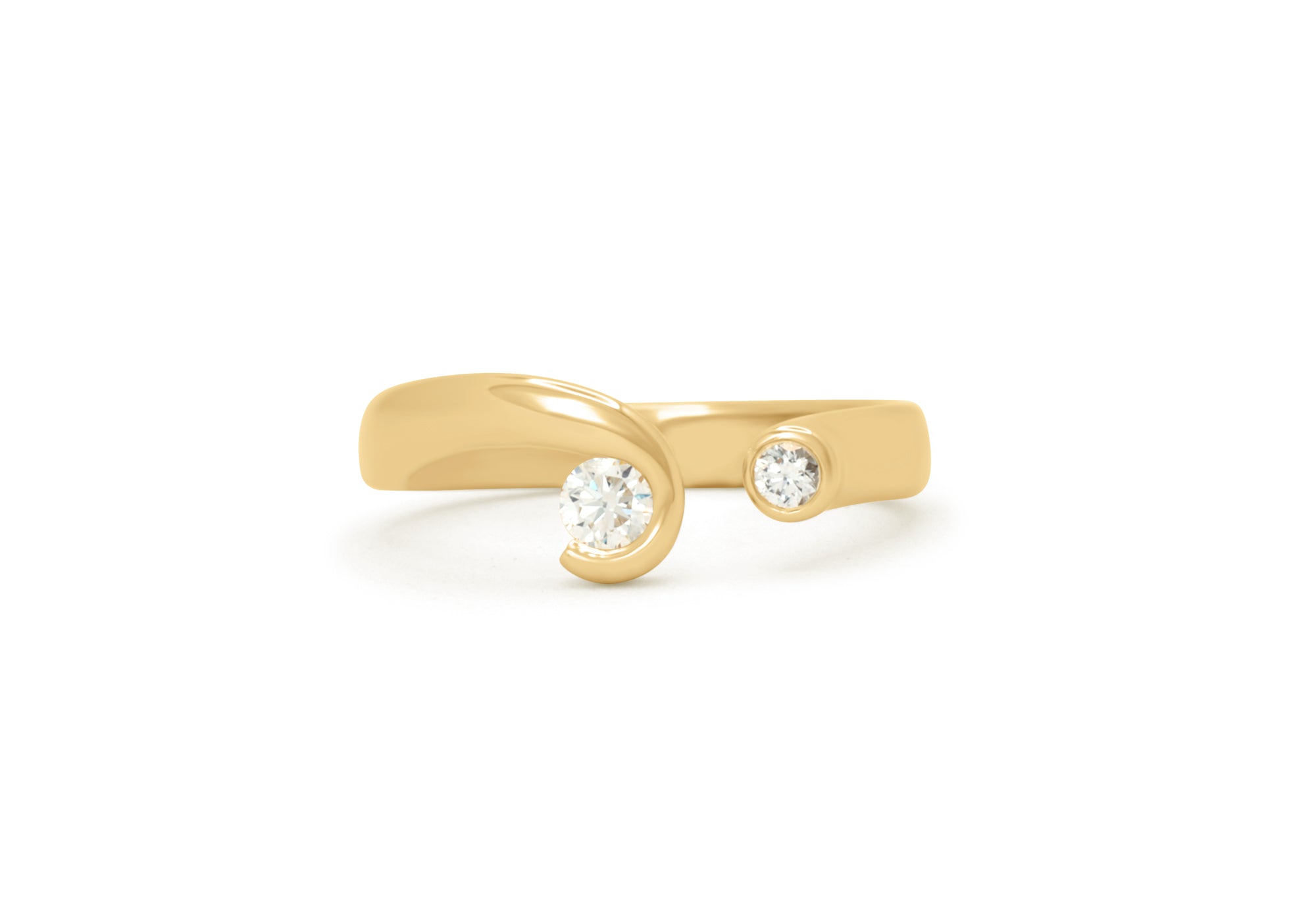 - Adorned by two beautiful diamonds, one set in a wave of metal.