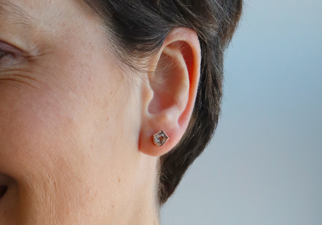 - Gold button earrings with a 5 mm morganites.
