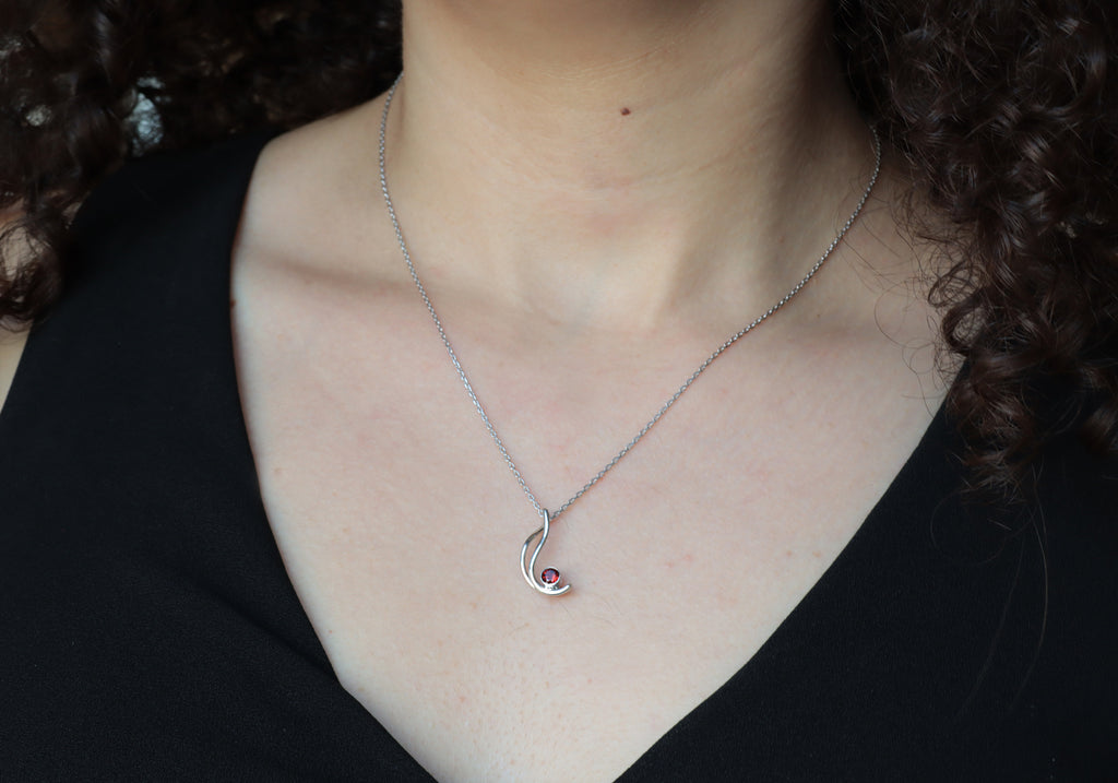 Curved pendant set with a round garnet on rhodium-plated 925 silver.