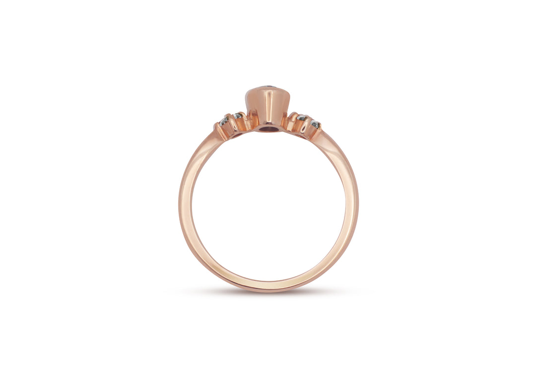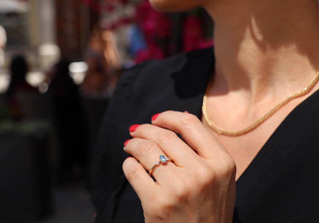 - Engagement ring with a 6 x 4 mm Teal moissanite in a bezel setting.