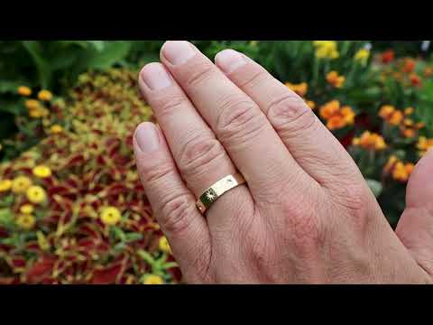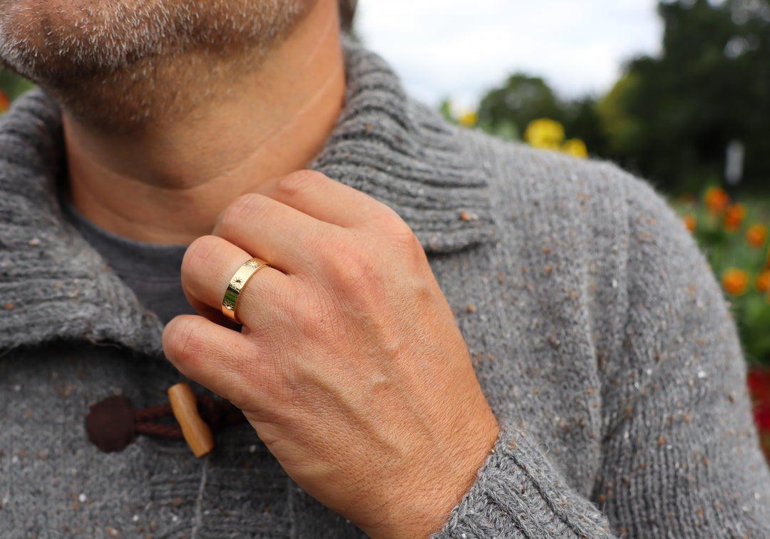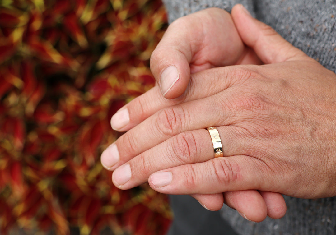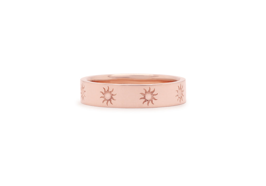 - Sun design engraved on a polished gold band .